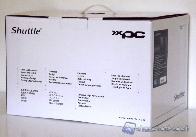 Il prodotto di Shuttle è allogiato dentro una scatola essenzialmente dallo sfondo bianco dove sono messi in evidenzia il marchio Shuttle, la scritta XPC ed alcune caratteristiche principali del prodotto.