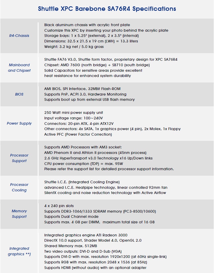 La Mainboard Shuttle FA76 V3.0 ha un form factor proprietario ed è stata progettata per essere inserita in questo XPC SA76R4. Il Northbridge è l'AMD 760G mentre il Southbridge è l'SB710, entrambi dotati di dissipazione passiva. L'alimentazione è affidata in parte a condensatori allo stato solido, per le aree più critiche. Il sistema dispone di un AMI BIOS, SPI Interface, 32MBit Flash-ROM, che consente il boot a partire da USB.