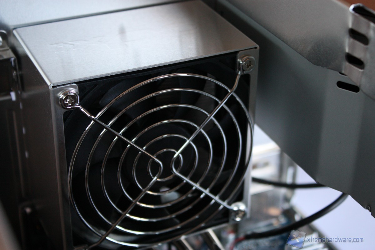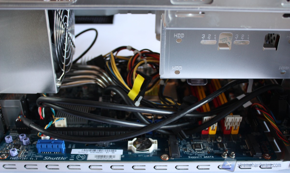 Come possiamo notare l’ordine e la cura sono di casa per Shuttle ed infatti possiamo notare sulla sinistra l’imponente dissipatore I.C.E. 2 con relative heat-pipes e la grande ventola da 92mm, adibita allo smaltimento del calore generato dalla CPU. Sulla destra troviamo il cestello per l’Hard Disk o SSD (di cui non sono presenti adattatori per l’installazione) ed un’unità da 5,25 pollici. Al di sotto troviamo invece la scheda madre di fabbricazione Shuttle modello FH87/FZ87 V1.1 dotata di quattro slot DDR3, uno slot PCI-Express 3.0 x16 ed uno slot PCI-Express 2.0 x4. La scheda madre posta all’interno di questo Barebone ha un Form Factor proprietario quindi non potrà essere sostituita con altre mainboard se non identiche a quella pre-installata. Un modello retail in formato mini-ITX potrebbe entrare nel cabinet ma potrebbe richiedere dei lavori di modding. Svitando le due viti poste all’estremità superiore del cestello, avremo accesso alla parte inferiore della scheda madre dove troviamo gli Slot per la memoria RAM in formato DDR. Nella parte sinistra al dissipatore I.C.E. 2 di Shuttle troviamo l’alimentatore da 500 Watt certificato 80 Plus Bronze che garantirà stabilità ed efficienza al nostro sistema.