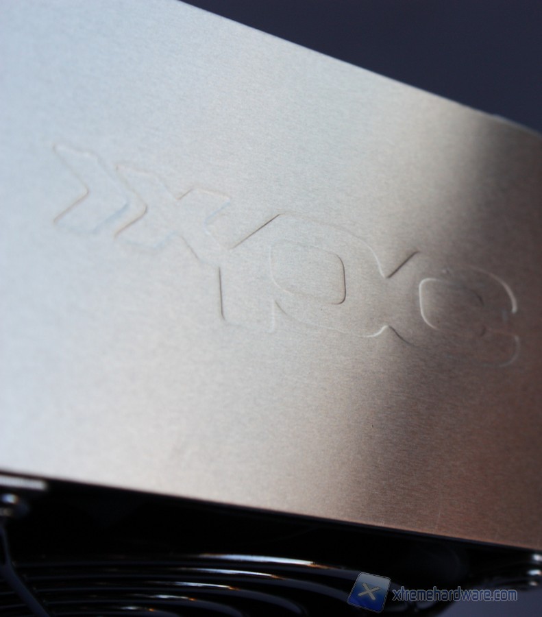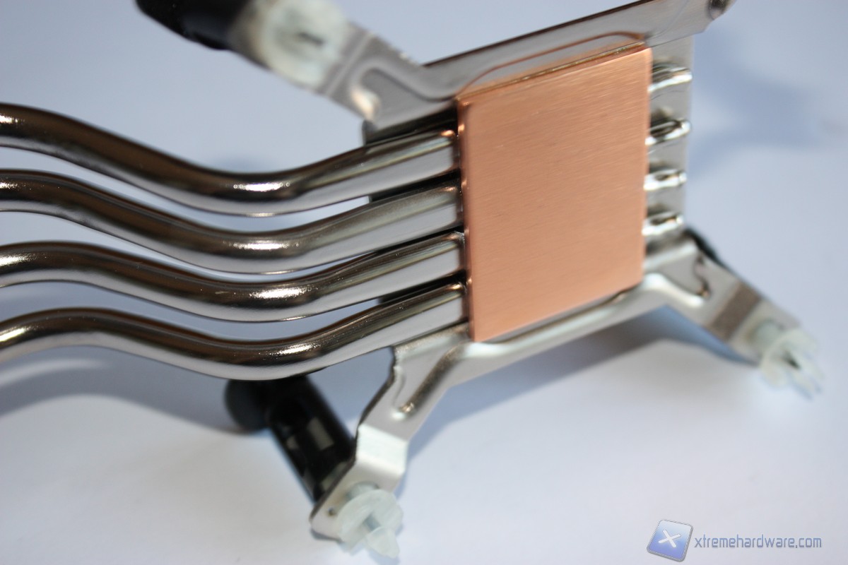 Analizzando il dissipatore, esso è dotato di una ventola della AVC modello DS09225R12HP207 con un diametro di 92 millimetri e connettore PWM a quattro pin in grado di regolare in modo adeguato la velocità di rotazione in base al carico della CPU. Il sistema di dissipazione è realizzato in un unico corpo di alluminio alettato con quattro Heat-pipes, ricordiamo che il fratello SH87R6 ne aveva solo tre, che lo percorrono fino alla base di contatto con la CPU, interamente in rame. La base di contatto non è realizzata a specchio, ma ad un primo sguardo questa risulta perfettamente planare, priva di sbavature o di difetti. Ai lati del corpo lamellare troviamo due strisce in feltro che assorbono le vibrazioni generate dal corpo metallico presente intorno a questo. Il “cestello” al suo interno ospita la ventola da 92mm, è ben rifinito e presenta il logo XPC inciso nella parte esterna del corpo.