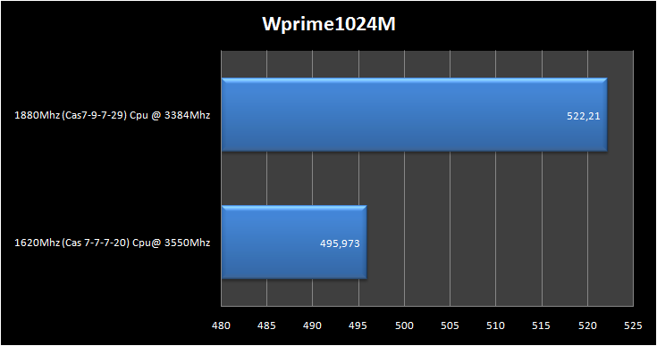 Come possiamo notare nel SuperPi e nel Wprime, anche se le ram si trovano a 1620mhz, abbiamo ottenuto un tempo minore grazie alla frequenza della cpu più alta di circa 200mhz. Entrambi le utility giovano molto di quest’ultima, dato che sfruttano maggiormente la potenza di calcolo della cpu. Negli specifici benchmark di memoria dell’utility SiSandra, invece, notiamo il netto miglioramento nei test a 1880Mhz.