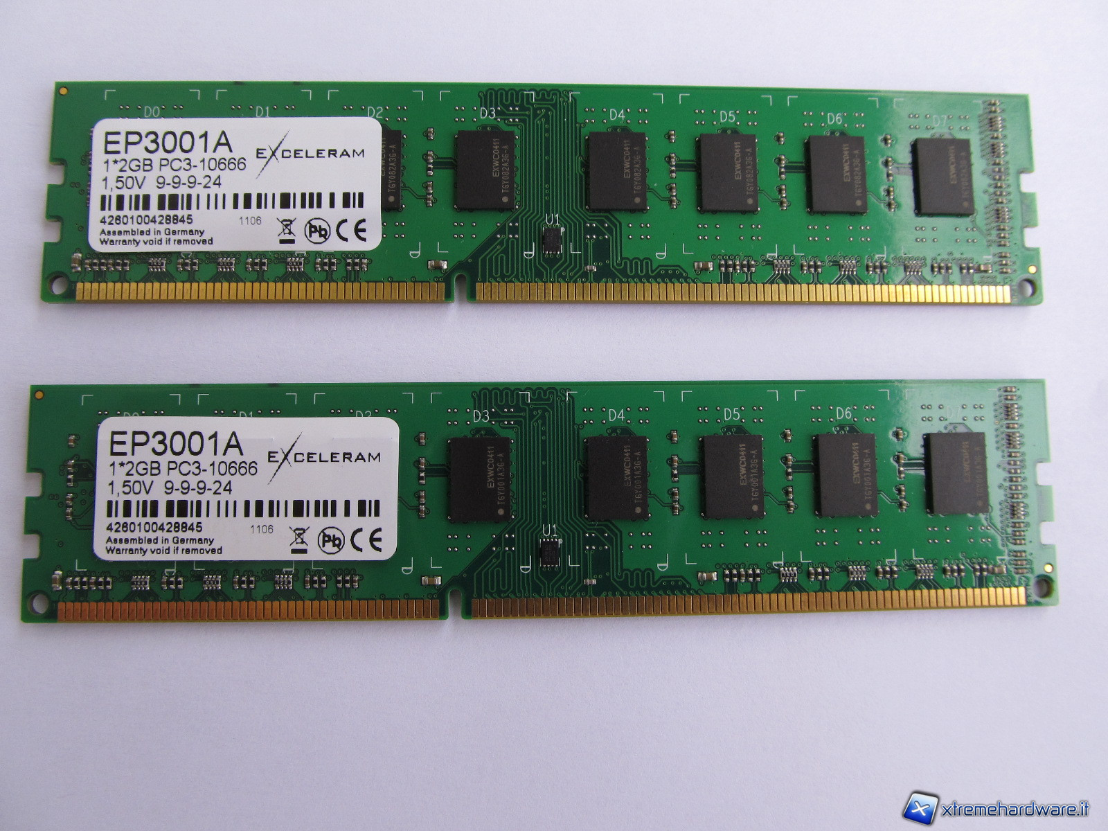 Trattandosi di moduli di memoria di tipo “Value” le Exceleram EP3001A si presentano sprovviste di qualsiasi sistema di dissipazione di calore, quindi come possiamo vedere i moduli sono caratterizzati dal classicissimo PCB di color verde comprendente 8 chip di memoria per lato.