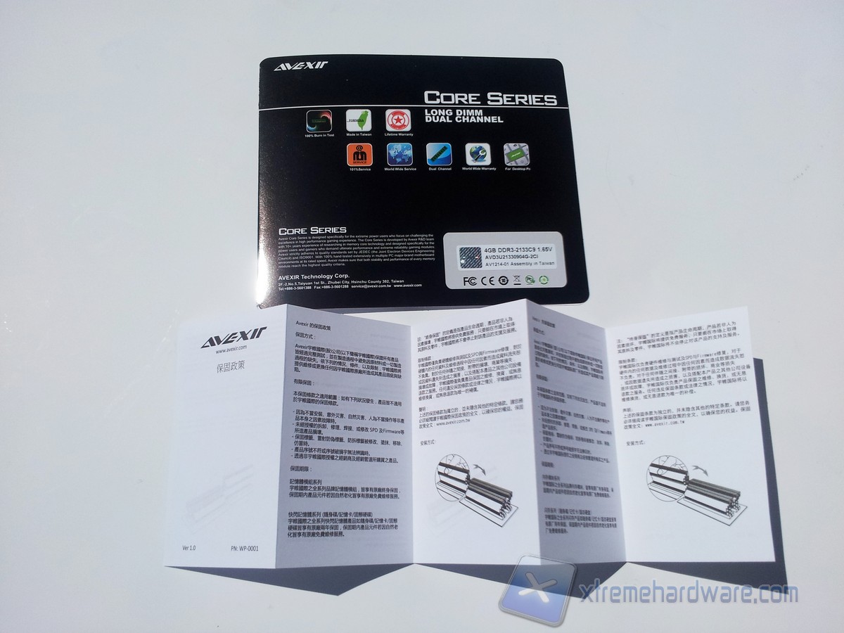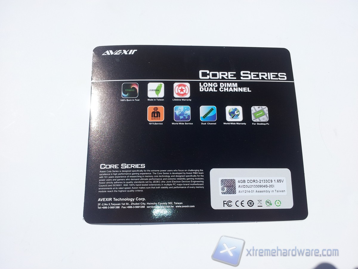 Nella parte bassa troviamo una descrizione della serie Core, i contatti AVEXIR e, a destra, un adesivo riportante le specifiche ed il part number. In questo caso il codice non riguarderà l'intero kit, ma solo le specifiche di un solo modulo; seppur quindi inerente ad un modulo da 4GB, il kit sarà composto da 2 moduli da 4GB ciascuno.
