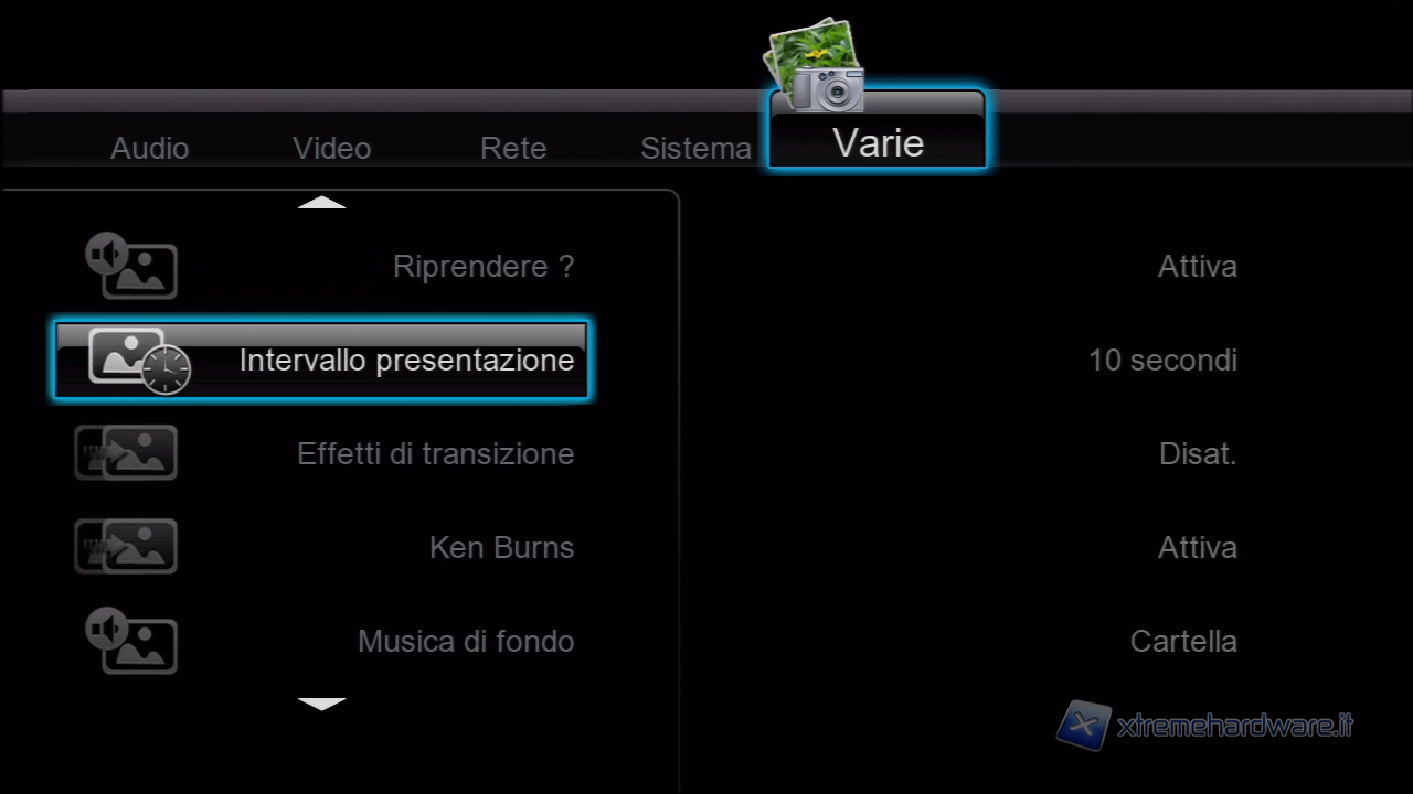 Permette di impostare le configurazioni riguardanti audio, video, rete, sistema e altre tipo la slideshow di foto con sottofondo musicale.