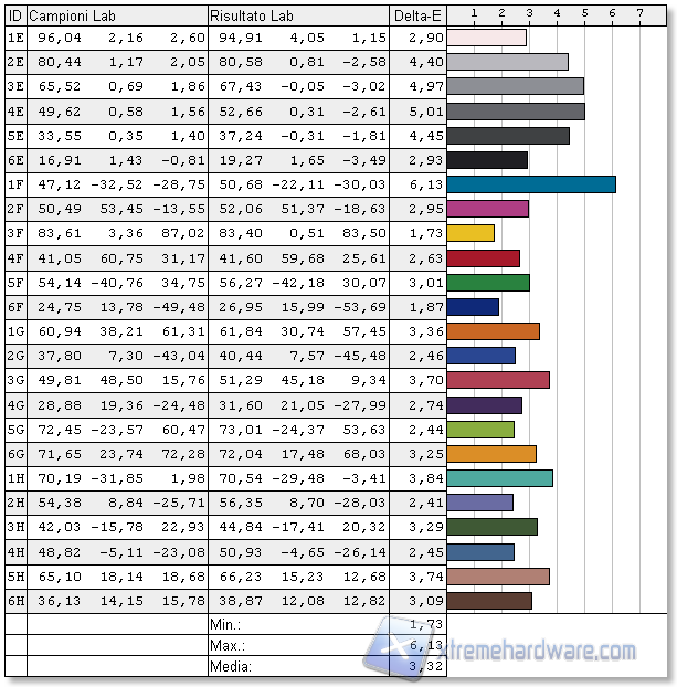 Neanche la fedeltà cromatica nelle condizioni out-of-box risulta soddisfacente, facendo registrare un Delta-E medio di 3,32.