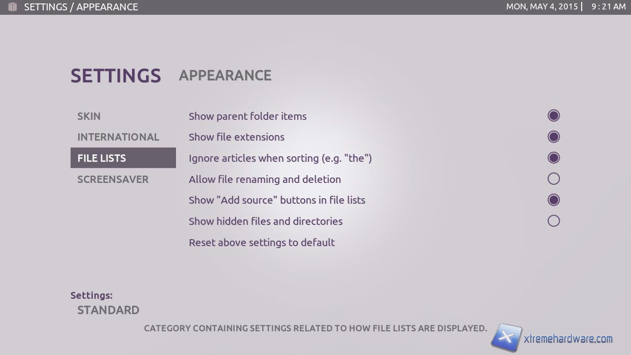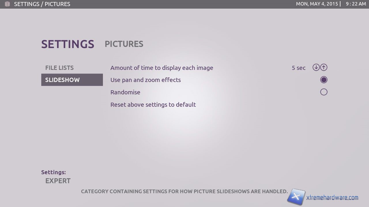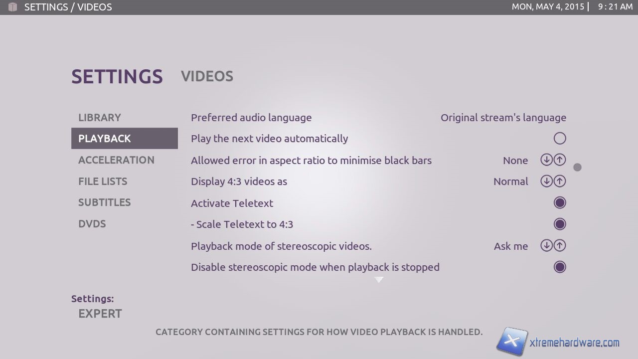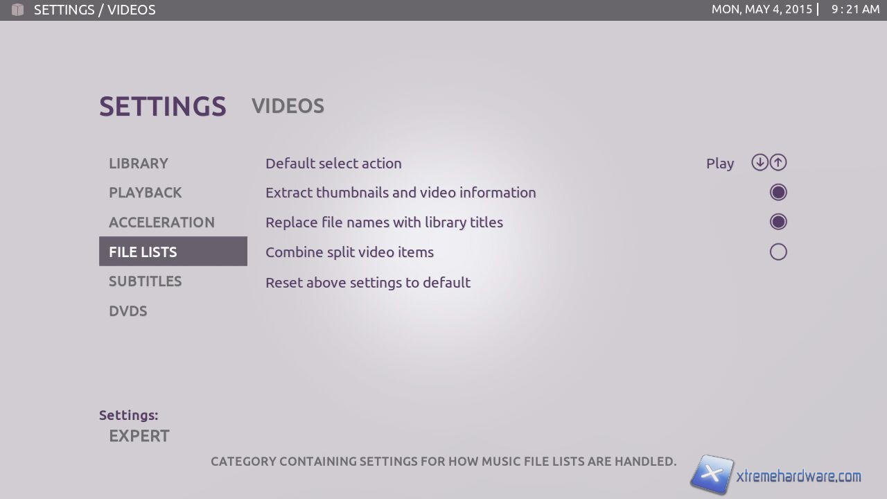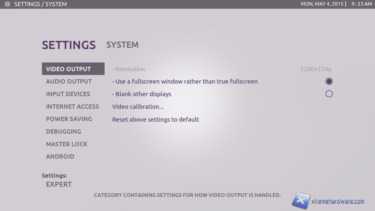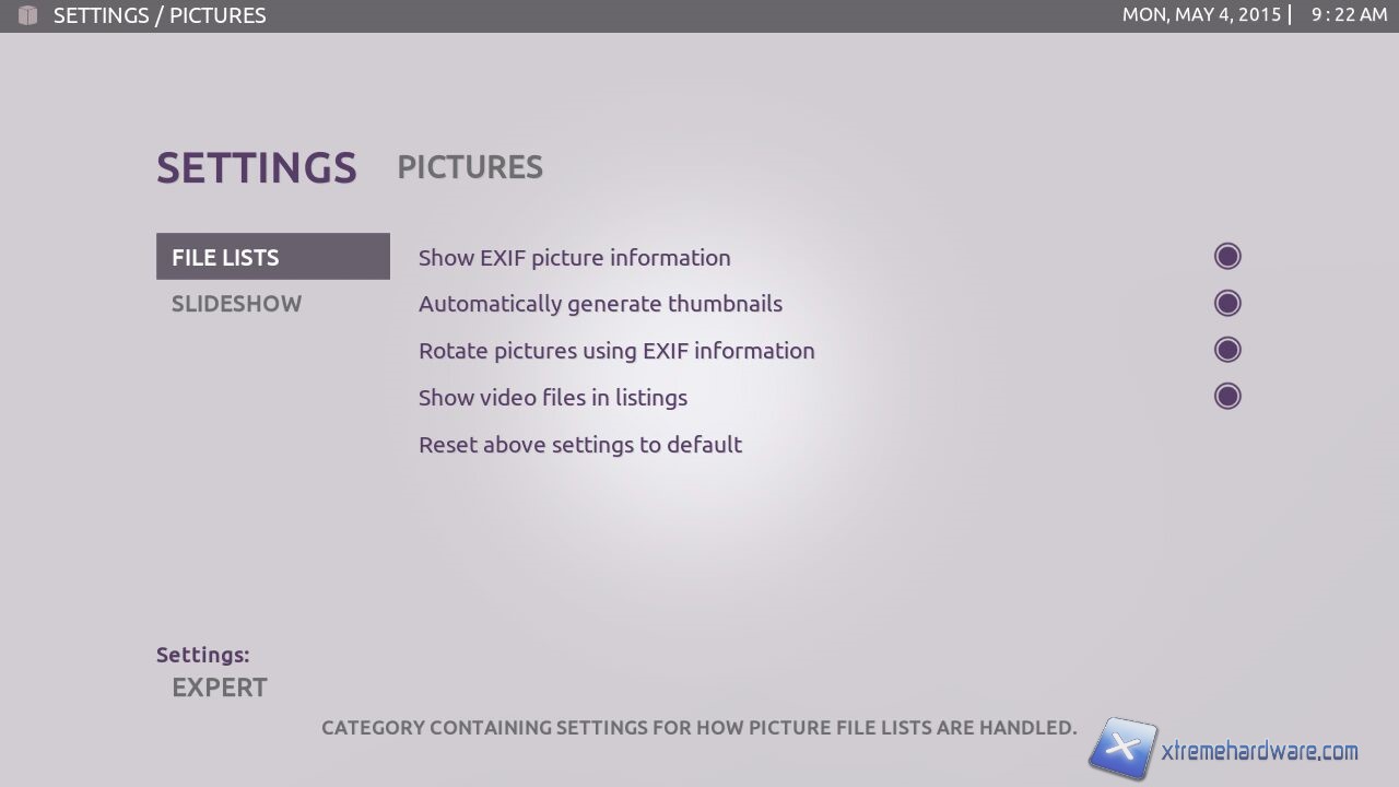 Ora andiamo brevemente ad analizzare i vari Menù. Partiamo dal Menù ‘’Settings’’. Qui come vediamo sono presenti delle sottocategorie che ci daranno la possibilità di accedere e settare determinate opzioni video, suono, aspetto e così via. Nel complesso comunque potremo impostare la risoluzione (purtroppo in questa release bloccata ad output 720p per l’interfaccia ma in output massimo di 1080p per la riproduzione video), la fonte sonora, la lingua, l’orario, la skin ed altre opzioni che potrete leggere dagli screen. Inoltre, settando la lingua italiano dal Menù questa non essendo correttamente scalata graficamente porterà a delle sovra scrizioni nei titoli principali ma non per le altre voci per cui vi consigliamo, se non avete problemi con l’inglese, di lasciarla di default o se non vi darà fastidio questo ‘’bug’’ di lasciarla in italiano. Pivos inoltre viene incontro a coloro che non amano smanettare o comunque non sono così esperte di settare voci o parametri aggiuntivi grazie a tre tipi di Visualizzazioni che sono: ‘’Standard’, ’’Advanced’’ e ‘’Expert’’. Grazie a questa funzione e come potete vedere verranno mostrate a seconda del tipo di ‘’visualizzazione’’ solo alcune voci.
