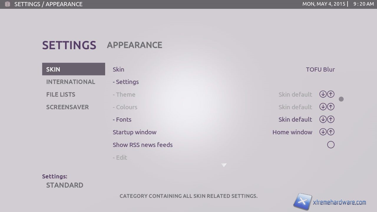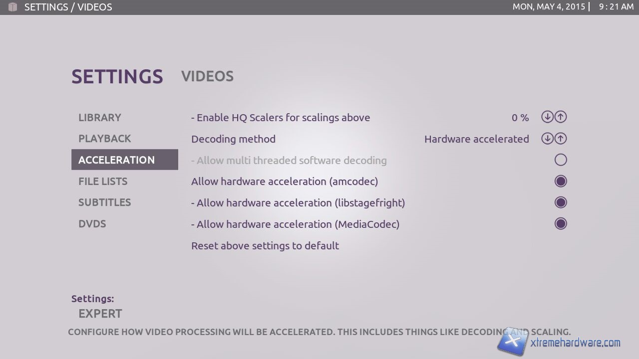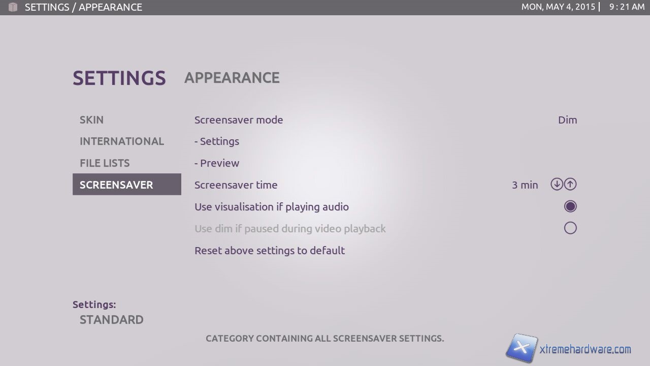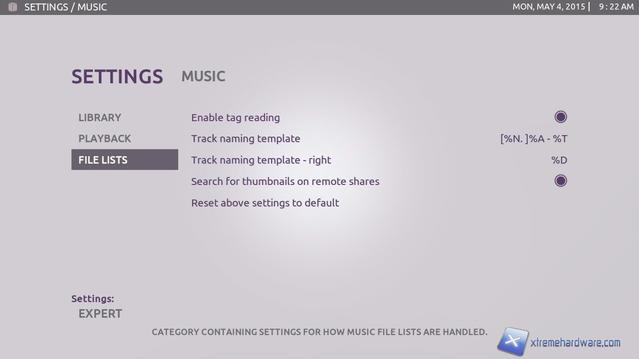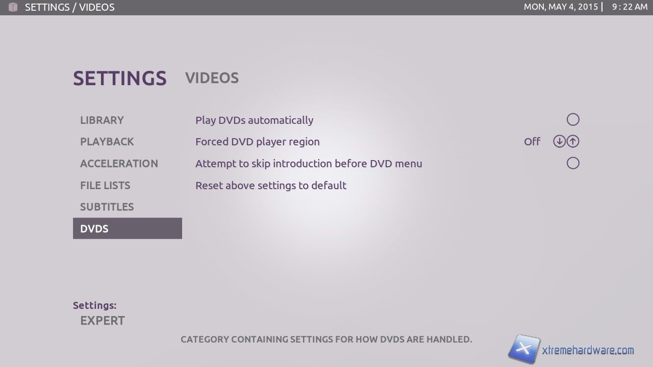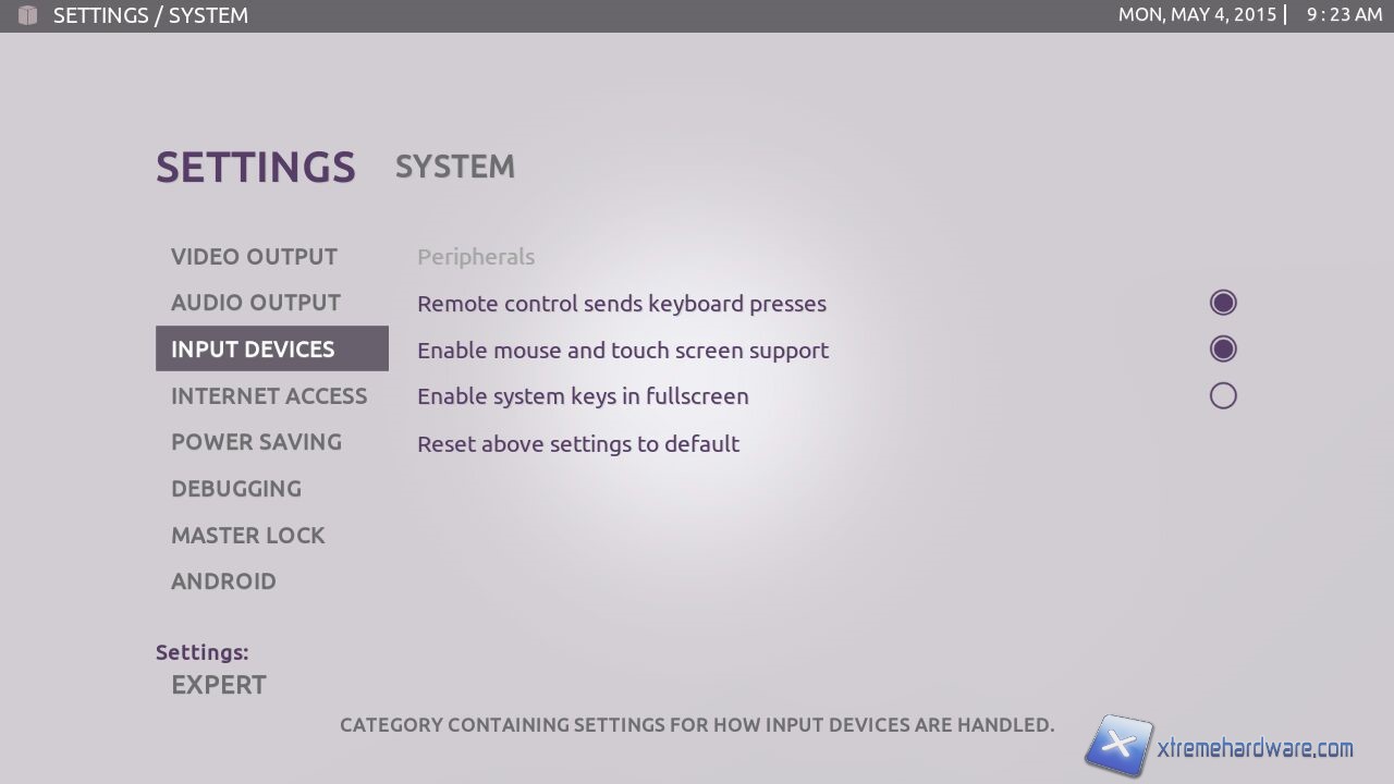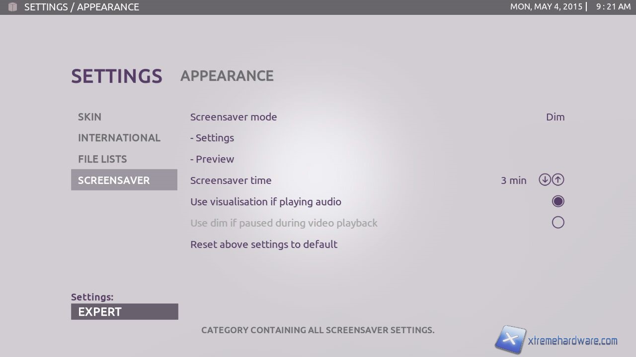 Ora andiamo brevemente ad analizzare i vari Menù. Partiamo dal Menù ‘’Settings’’. Qui come vediamo sono presenti delle sottocategorie che ci daranno la possibilità di accedere e settare determinate opzioni video, suono, aspetto e così via. Nel complesso comunque potremo impostare la risoluzione (purtroppo in questa release bloccata ad output 720p per l’interfaccia ma in output massimo di 1080p per la riproduzione video), la fonte sonora, la lingua, l’orario, la skin ed altre opzioni che potrete leggere dagli screen. Inoltre, settando la lingua italiano dal Menù questa non essendo correttamente scalata graficamente porterà a delle sovra scrizioni nei titoli principali ma non per le altre voci per cui vi consigliamo, se non avete problemi con l’inglese, di lasciarla di default o se non vi darà fastidio questo ‘’bug’’ di lasciarla in italiano. Pivos inoltre viene incontro a coloro che non amano smanettare o comunque non sono così esperte di settare voci o parametri aggiuntivi grazie a tre tipi di Visualizzazioni che sono: ‘’Standard’, ’’Advanced’’ e ‘’Expert’’. Grazie a questa funzione e come potete vedere verranno mostrate a seconda del tipo di ‘’visualizzazione’’ solo alcune voci.