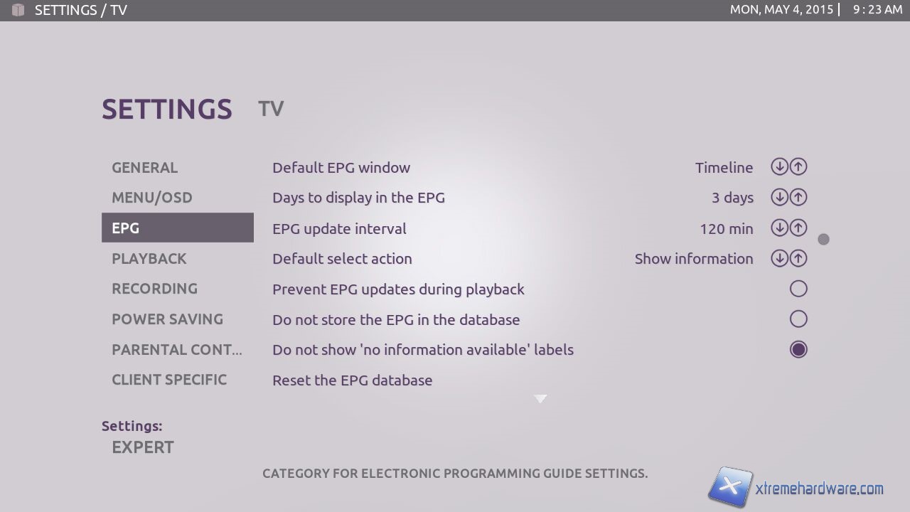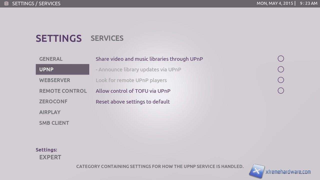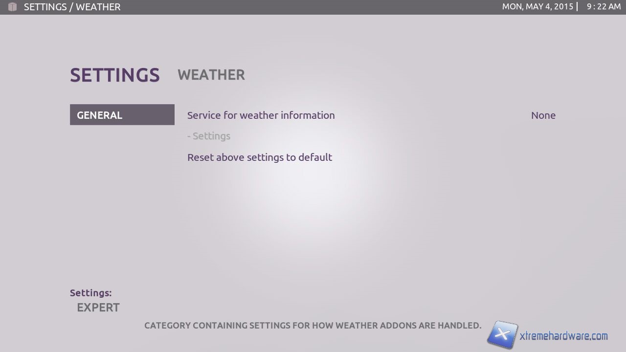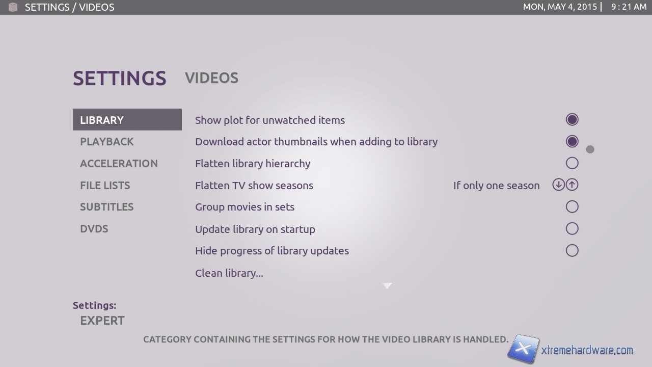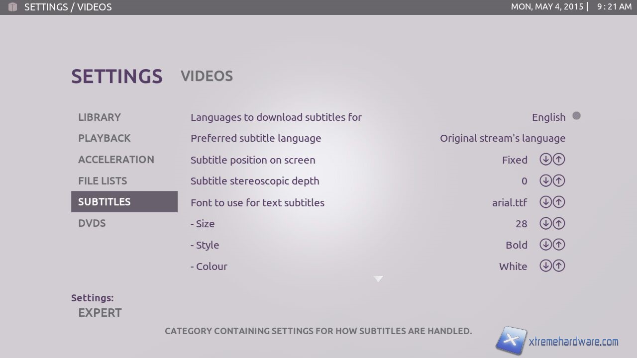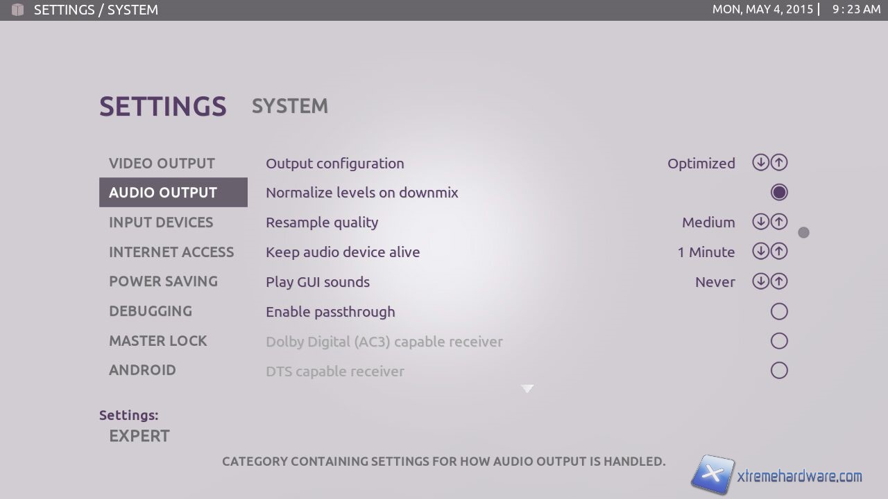 Ora andiamo brevemente ad analizzare i vari Menù. Partiamo dal Menù ‘’Settings’’. Qui come vediamo sono presenti delle sottocategorie che ci daranno la possibilità di accedere e settare determinate opzioni video, suono, aspetto e così via. Nel complesso comunque potremo impostare la risoluzione (purtroppo in questa release bloccata ad output 720p per l’interfaccia ma in output massimo di 1080p per la riproduzione video), la fonte sonora, la lingua, l’orario, la skin ed altre opzioni che potrete leggere dagli screen. Inoltre, settando la lingua italiano dal Menù questa non essendo correttamente scalata graficamente porterà a delle sovra scrizioni nei titoli principali ma non per le altre voci per cui vi consigliamo, se non avete problemi con l’inglese, di lasciarla di default o se non vi darà fastidio questo ‘’bug’’ di lasciarla in italiano. Pivos inoltre viene incontro a coloro che non amano smanettare o comunque non sono così esperte di settare voci o parametri aggiuntivi grazie a tre tipi di Visualizzazioni che sono: ‘’Standard’, ’’Advanced’’ e ‘’Expert’’. Grazie a questa funzione e come potete vedere verranno mostrate a seconda del tipo di ‘’visualizzazione’’ solo alcune voci.