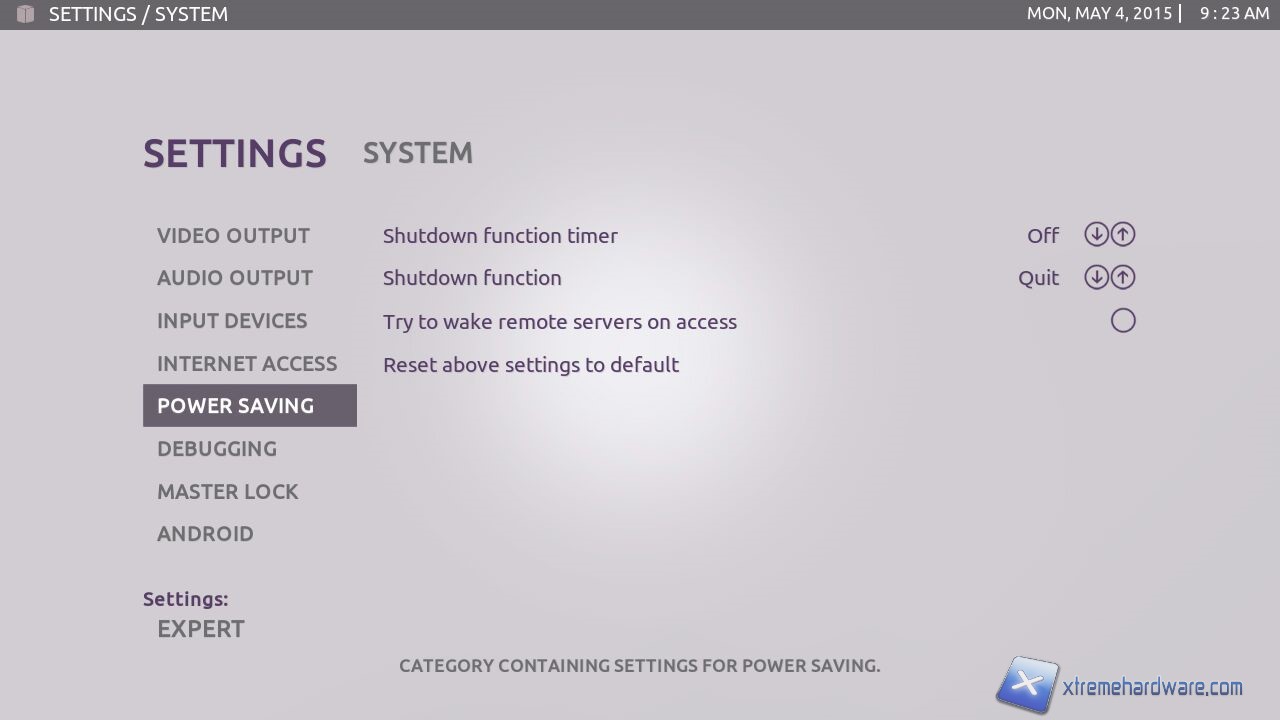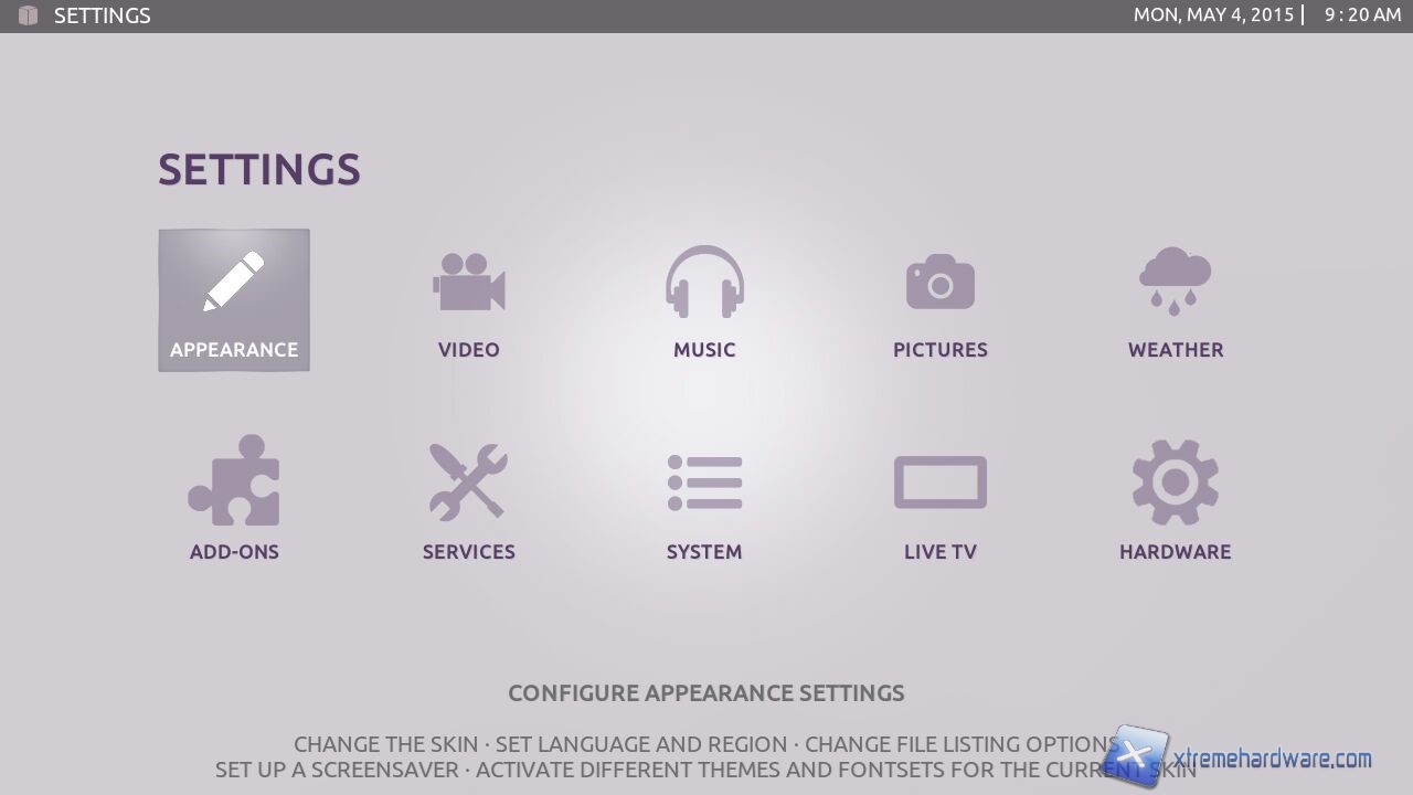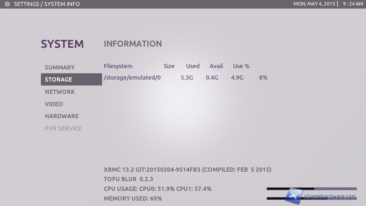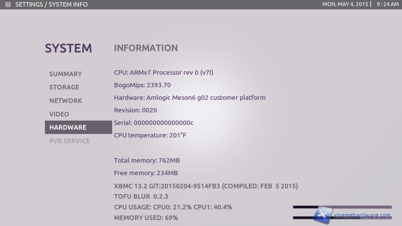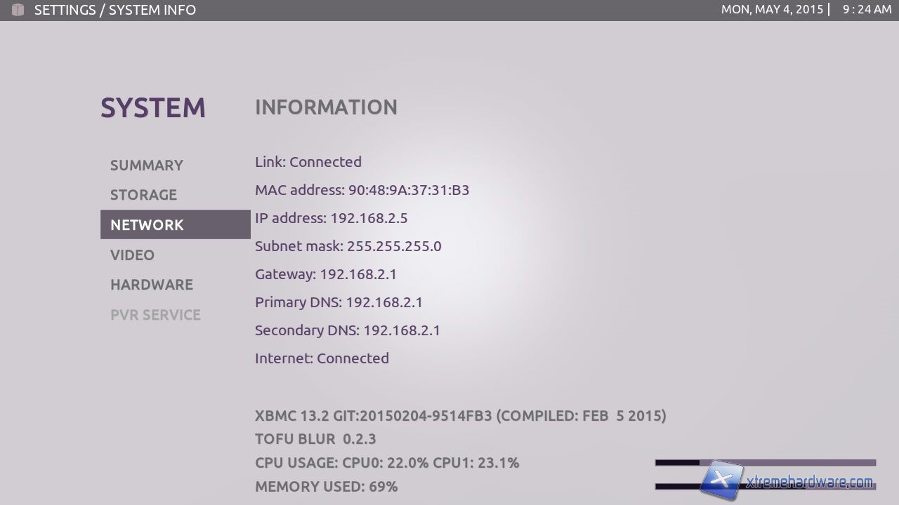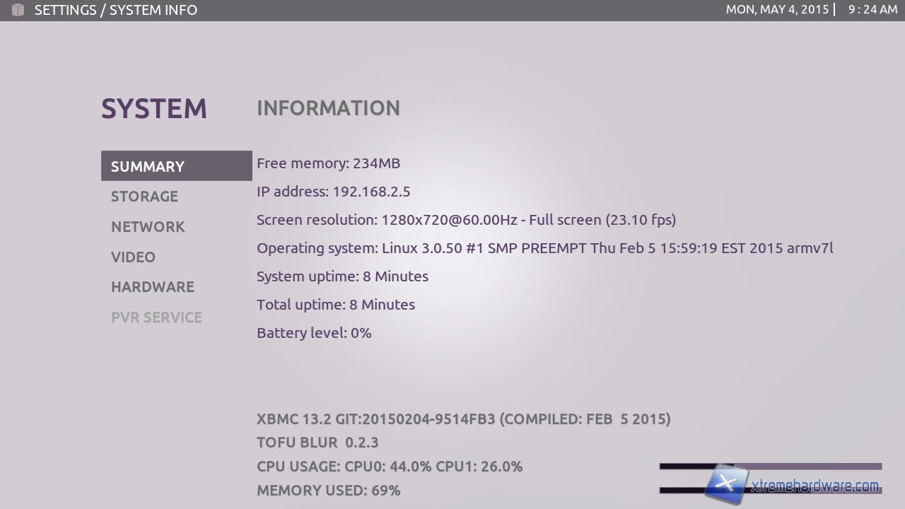 Da uno dei tanti Menù delle impostazioni potremo inoltre controllare l’hardware installato nello XIOS XS o controllare come se fosse un Task Manager la richiesta di risorse quali carico sulla CPU Dual Core (percentuale separata per Core) o Memoria Utilizzata o ancora lo spazio a disposizione, i dati inerenti la connessione, la temperature della CPU (espressa in gradi Fahrenheit) ed i dati della piattaforma impiegata nel media player.