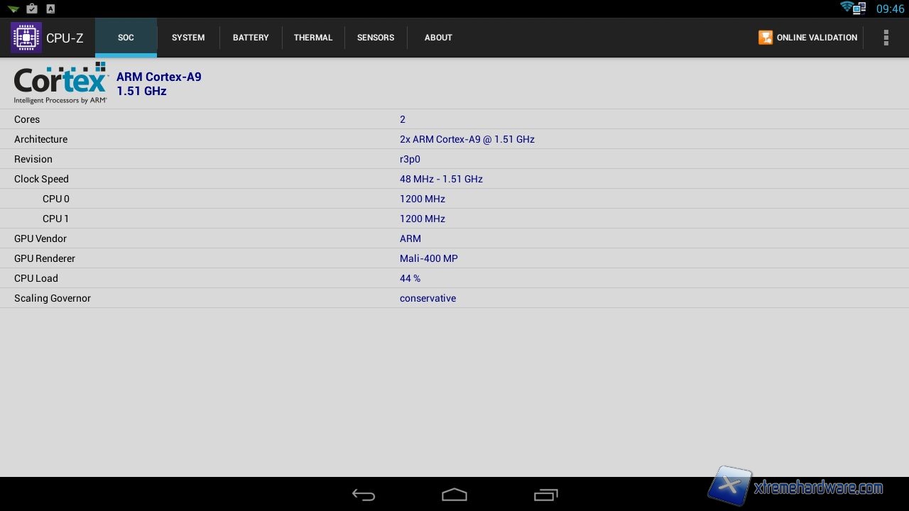Come prima cosa abbiamo scaricato e installato CPU-Z per verificare a fondo i dettagli tecnici ed Hardware del Pivos XIOS XS. Ci viene mostrata l’architettura Dual Core ARM Cortex-A9 con frequenza minima di 48MHz e massima di circa 1.51GHz. Inoltre, è confermato il comparto grafico affidato ad una Mali-400 MP di fascia bassa-media che supporta OpenGL ES 2.0 con una frequenza di 650 Mhz ed una cache di livello 2 massima di 512KB. La RAM disponibile è di 1GB a cui si aggiungono i 8GB di eMMC per app e dati. A seguire notiamo come sia implementato un sistema Android KitKat 4.4.2.
