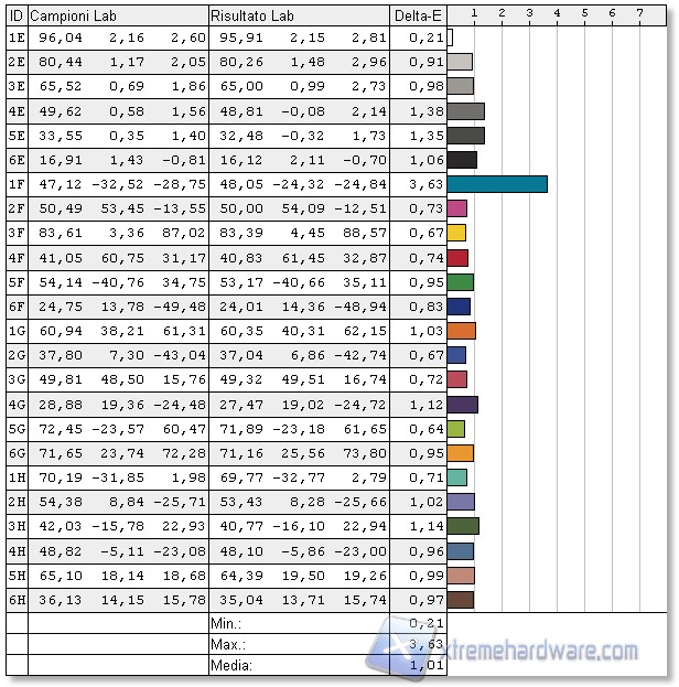Il profilo colore non può stravolgere la buona calibrazione di fabbrica. La temperatura scende un pochino, dando un aspetto leggermente più caldo, ma migliora di un punto percentuale il gamut sullo spazio colore Adobe RGB (dal 79% all’80%) e la fedeltà cromatica che passa da un valore medio del Delta-E di 1,54 a 1,01. Si ricorda che la calibrazione non è stata eseguita con la modalità sRGB, che di default ha fatto registrate un eccellente valore di 0,66.