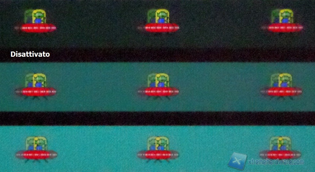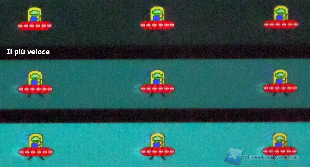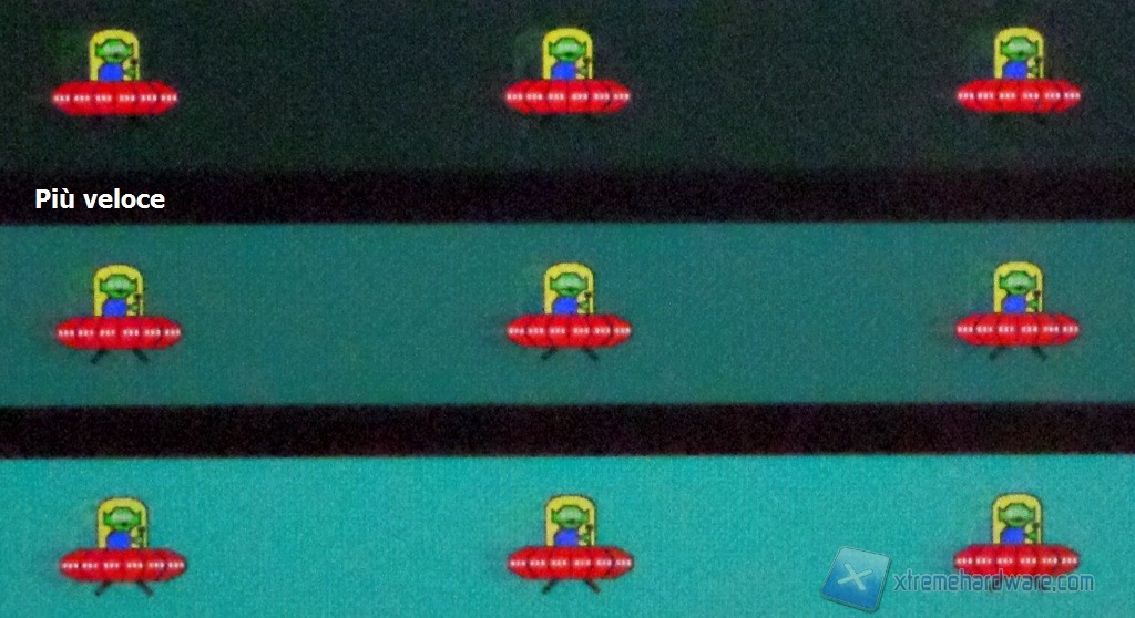 C’è poco da girarci intorno. Non è monitor gaming e la reattività non è il suo forte, ovviamente. Nell’analisi dei risultati medi, il setting “veloce” è quello che forse restituisce un comportamento migliore. Anche se potrebbe non sembrare dalle foto, i valori più spinti generano overshoot di segnale ben visibile ad occhio (maggiormente per il setting estremo), manifestando la scia più scura. In gaming l’effetto non è così evidente e si potrà provare anche il setting “più veloce”.