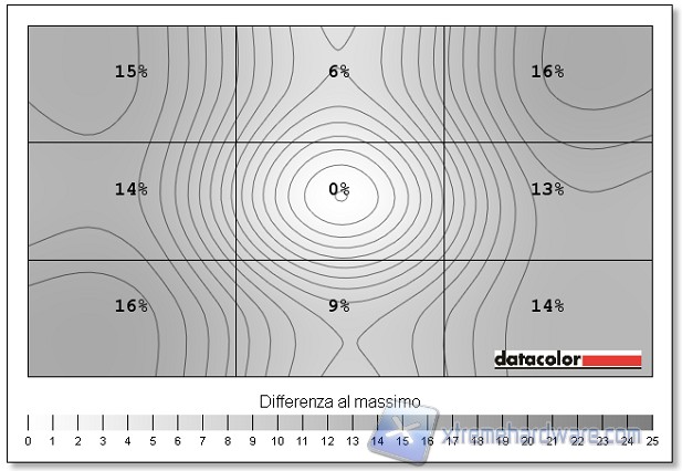 In questo test andiamo a valutare la deviazione colorimetrica all’aumentare dell’angolo di visione per i quattro lati. In questo test prevalgono in genere i display a matrice IPS / PLS / AHVA; seguono i VA e infine i TN. Trattandosi di un pannello AHVA i risultati sono piuttosto buoni, ma forse un poco sotto la media dei migliori.