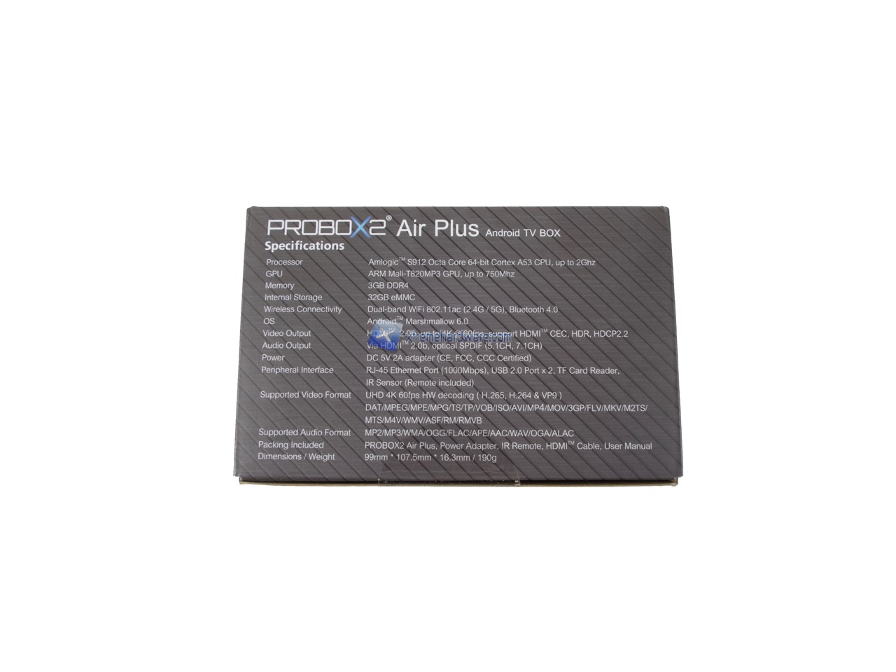 Il PROBOX2 Air Plus come sempre ci giungerà in una classica confezione di cartone di ridotte dimensioni sulla quale troveremo tutte le principali informazioni tra cui anche le specifiche tecniche riportate nella parte posteriore.