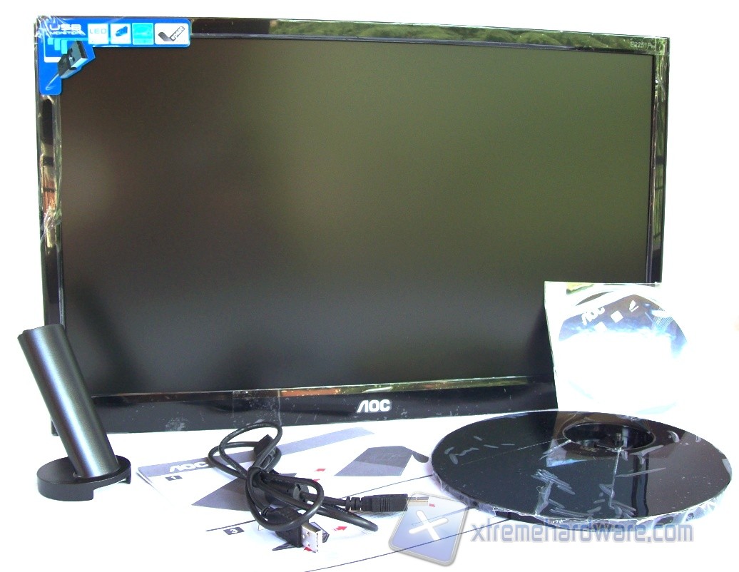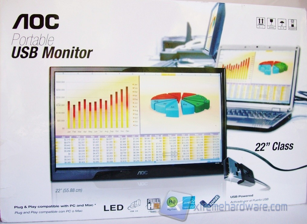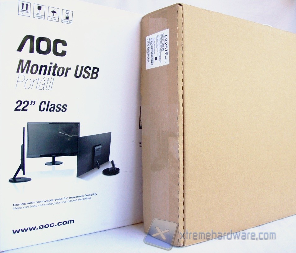La confezione misura 560 x 380 x 110 mm e rappresenta in breve le caratteristiche del monitor. L’immagine sulla parte frontale ci informa subito per quali esigenze l’AOC e2251Fwu è indicato. Nella stessa viene riportato infatti il monitor, senza piedistallo, collegato ad un notebook in configurazione Duplica. Nella zona inferiore sono indicate le funzionalità quali la compatibilità con piattaforma PC e Mac, il sistema di retroilluminazione a LED, la connessione USB 2.0, la risoluzione Full HD 1080p, certificazioni ENERGY STAR 5.0, EPEAT Silver e l’assenza di mercurio.