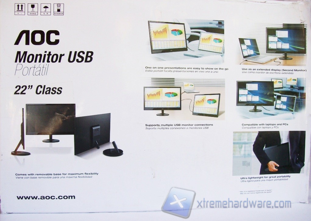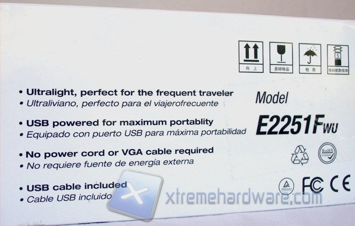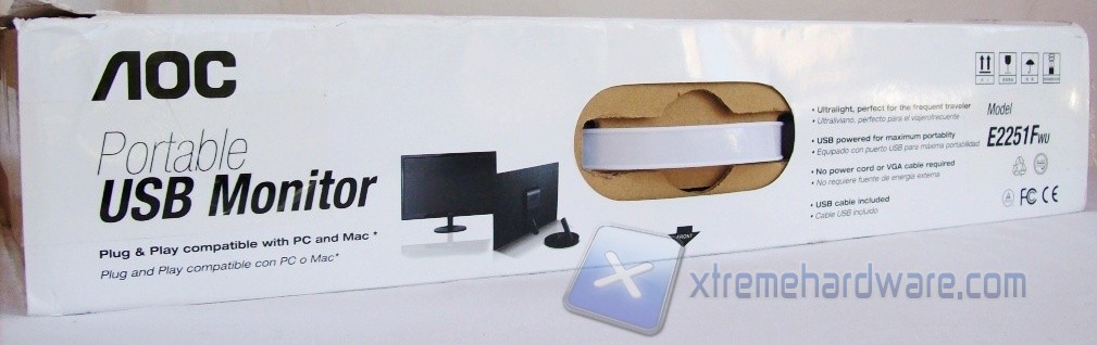 Sul retro, in lingua inglese e spagnola, vengono riportate le caratteristiche che contraddistinguono il monitor USB, mostrate precedentemente. Nella parte superiore è stata aggiunta una pratica maniglia per facilitarne il trasporto; i lati, ad eccezione di un adesivo identificativo, risultano privi di informazioni.