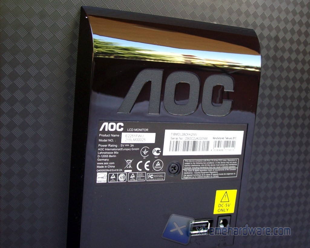 Posteriormente troviamo invece una trama in risalto che dimostra l’attenzione che AOC ha verso i propri prodotti. Oltre alle consuete informazioni riportate nel pannello posteriore, come il numero seriale, spicca la mancanza di una qualsiasi porta video, lasciando spazio alla sola presenza della connessione USB 2.0 e un connettore DC. Quest’ultimo è stato aggiunto qualora il PC in uso non sia in grado di fornire sufficiente corrente dalla presa USB. Sarà quindi necessario alimentare il monitor con un adattatore esterno, opzionale, con uscita DC 5V 3A.