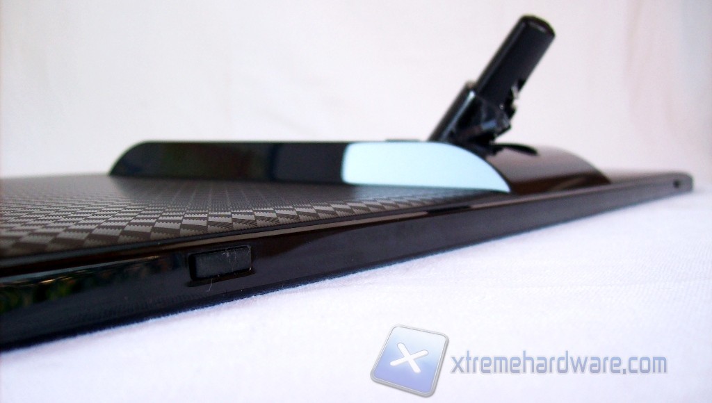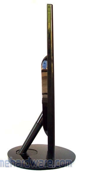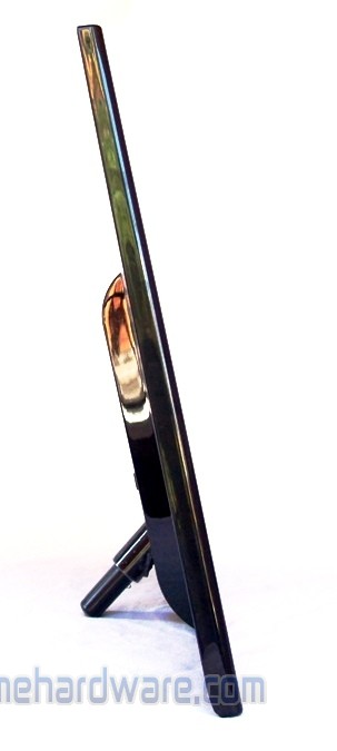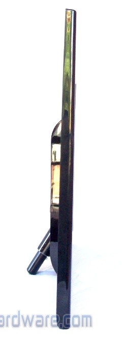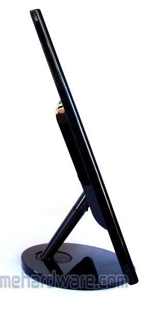 Sono inoltre presenti altri due gommini nella zona inferiore della cornice del display, utili per aumentare la stabilità in caso di rimozione del sostegno. Anche in questo caso è possibile regolare l’inclinazione dello schermo, ma è consigliabile non tenere il monitor perfettamente perpendicolare al tavolo, data l’esigua stabilità, e scegliere un’opportuna posizione piana. Con la rimozione della base, il monitor riduce l’altezza di 7 cm (320 mm) e lo spessore di 9 cm (105 mm) con angolazione massima.