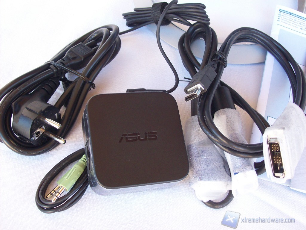 All’apertura della scatola potremo subito estrarre tutti gli accessori compresi nel bundle, mentre il pannello rimane compreso tra due strati di polistirene espanso e avvolto da una busta di plastica. Gli accessori che troviamo all’interno sono composti da: un cavo D-Sub, un cavo DVI-HDMI, un cavo jack audio con rivestimento in ferrite, l’alimentatore esterno con cavo apposito, una guida quick start e un opuscolo per la garanzia del prodotto.