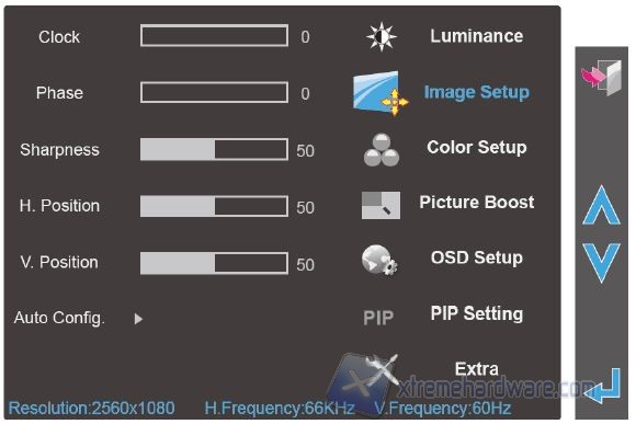 Il menù completo è composto da altre sottosezioni. Luminosità permette la regolazione del contrasto, della luminosità, scegliere la modalità di visione, il valore di gamma preimpostato, se attivare il contrasto dinamico (DCR) e regolare l’opzione overdrive. Le modalità sono: Standard (luminosità impostata a 90), Texto (20), Internet (40), Giochi (60), Film (80) e Sport (100). L’opzione gamma presenta tre impostazioni, mentre l’overdrive è regolabile su Debole, Medio, Forte e Disattivo; di default è presente su Medio. Come al solito, impostazioni immagine è disattivato per via della connessione digitale.