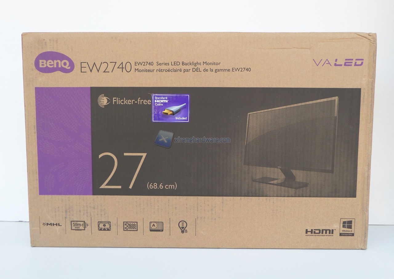 Sulla scatola del BenQ EW2740L troviamo alcune delle tecnologie già introdotte e specifiche tecniche riportate su un lato della stessa. Aprendola, abbiamo potuto estrarre un solo cavo, mentre tutto il bundle è ben incastonato tra le varie fessure del polistirolo che tiene fermo il display avvolto da una classica busta di plastica.