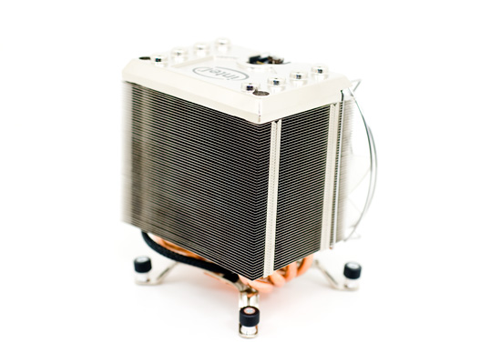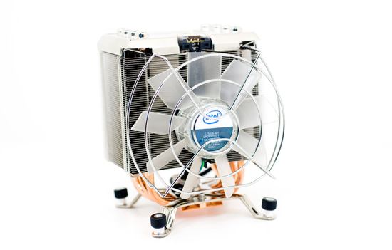 Il dissipatore fornito con il processore è marchiato Intel e ha il non facile compito di tenere a bada ben 130 W ad aria: non è un’impresa semplice. Il sample ricevuto in bundle con la CPU dispone di una base in rame da cui si diramano 4 heat pipe, raffreddate da una fitta serie di lamelle di alluminio, una configurazione classica per la tipologia a cui appartiene.