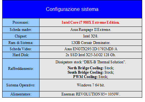 Un riassunto della configurazione di prova la trovare nella tabella sotto:Il processore testato è il Core i7 980X Estreme Edition, appartenenti alla famiglia Gulftown.