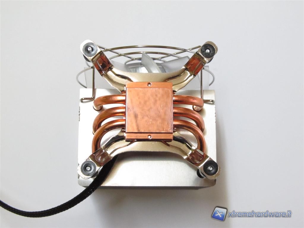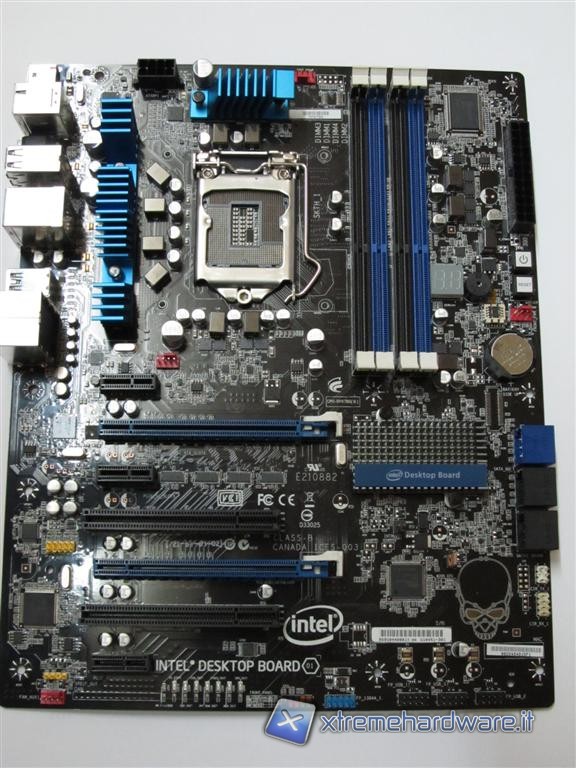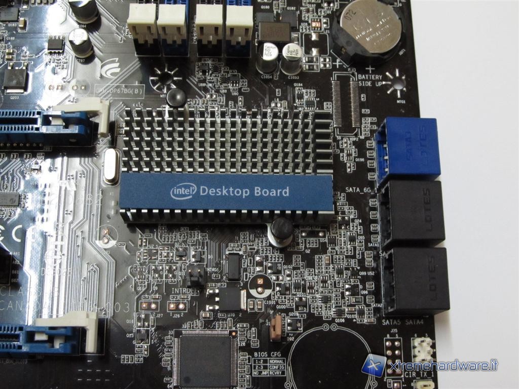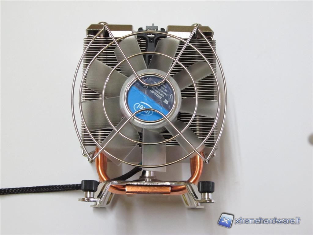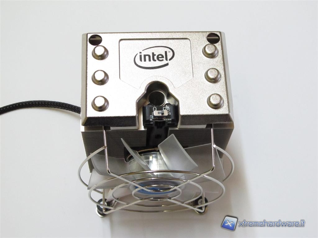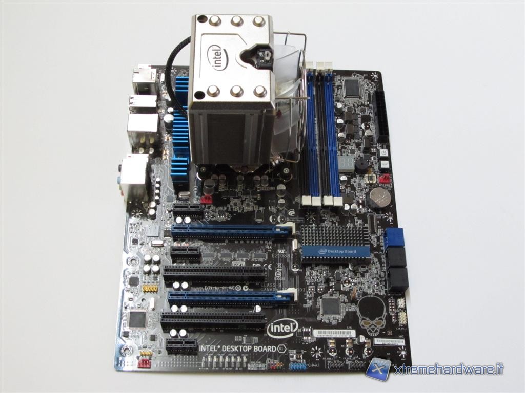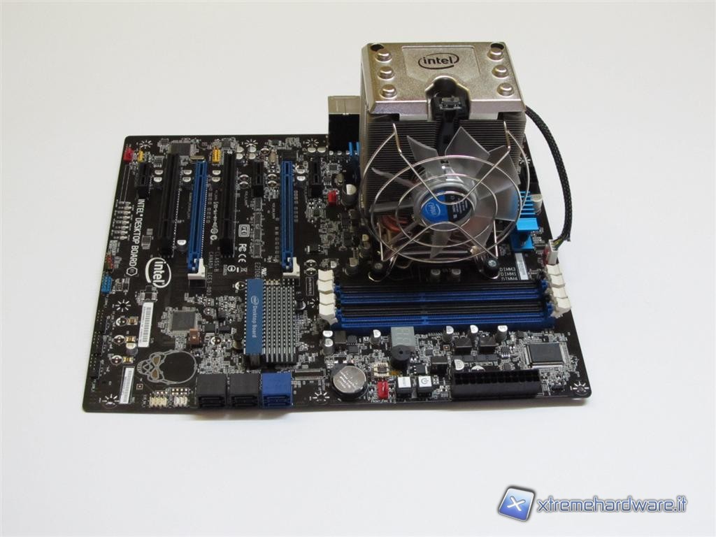 La scheda madre che Intel ci ha fornito per testare le nuove CPU appena rilasciate è la DP67BG denominata “Burrage”, accompagnata da un dissipatore Intel (opzionale) XTS100H, il quale è risultato essere molto più performante dei soliti dissipatori ‘stock’ compresi nel package retail delle CPU. osserviamo Oltre ad una struttura a torre dotata di heatpipe, l’XTS100H mette a disposizione dell’utente una interessante funzionalità per cambiare regime di rotazione della ventola tramite switch. Naturalmente è possibile gestire il regime di rotazione della ventola del dissipatore anche tramite BIOS, semplicemente scegliendo la Temperatura rilevata in cui la ventola debba aumentare il proprio regime, grazie al sistema di gestione PWM.