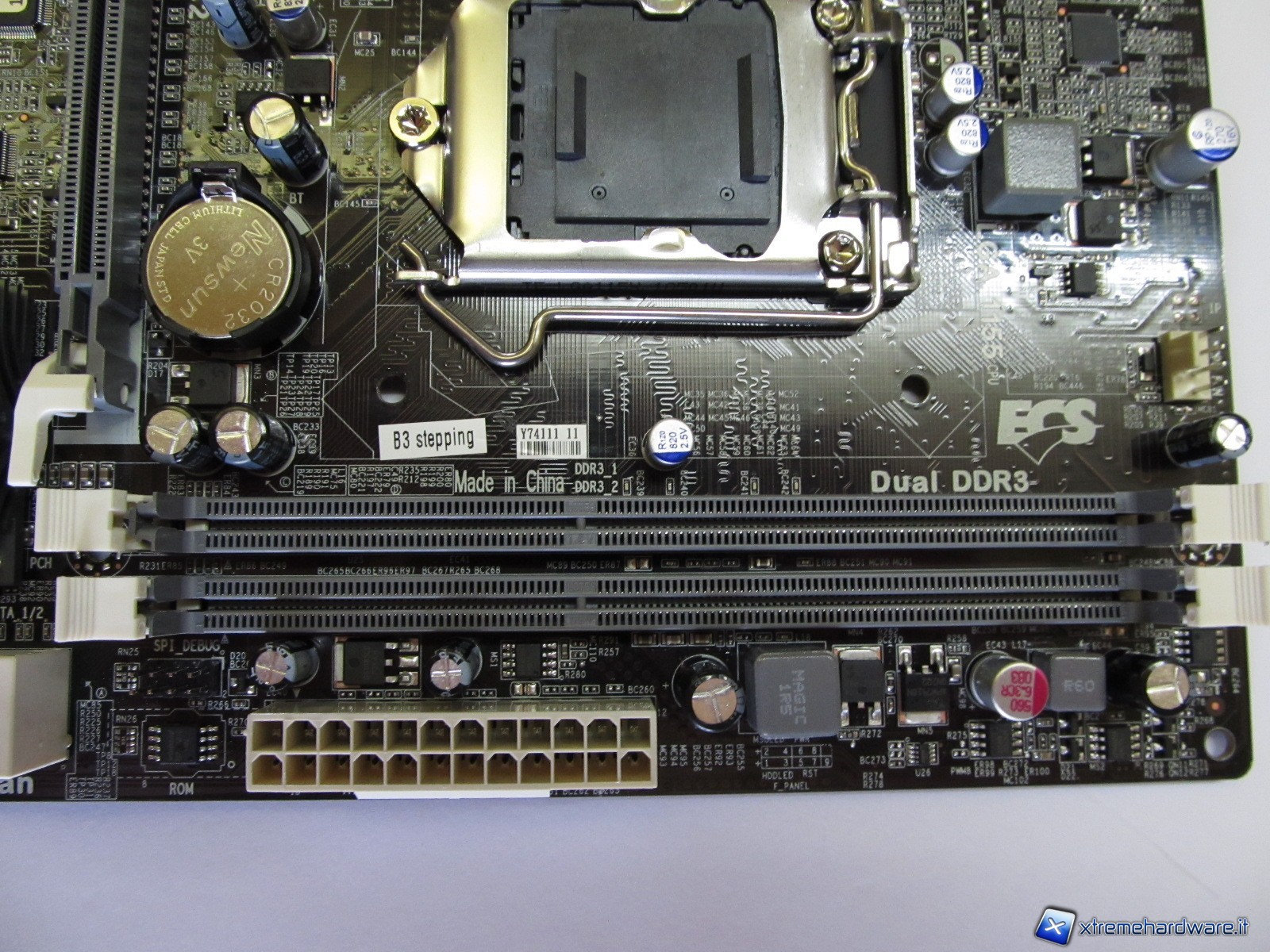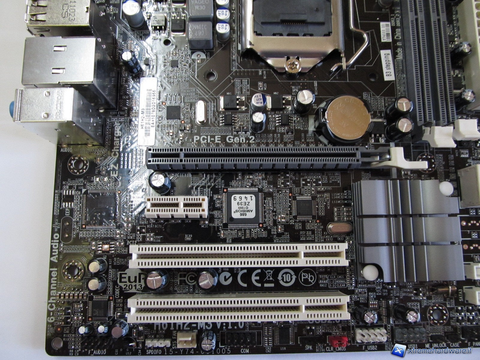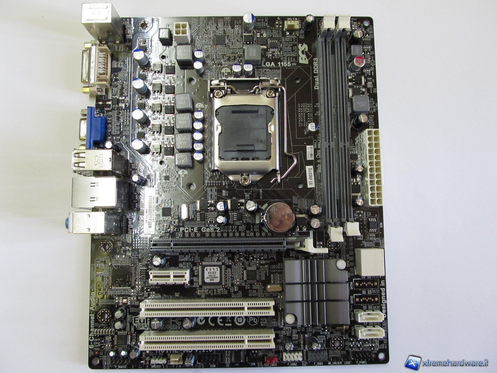 Poco sotto al socket possiamo osservare lo slot PCIe 16x per le VGA dedicate, uno slot PCIe x1 e due slot PCI. Accanto allo slot PCIe 16x troviamo il dissipatore del Chipset H61 (Cougar Point) e le quattro porte SATA 3Gb/s di cui due sono posizionate con attacco verticale; infine osserviamo tutti gli attacchi che tradizionalmente si ritrovano sul perimetro della piastra madre, cioè i pin del pannello frontale, le porte USB on-board, e il jumper CMOS.