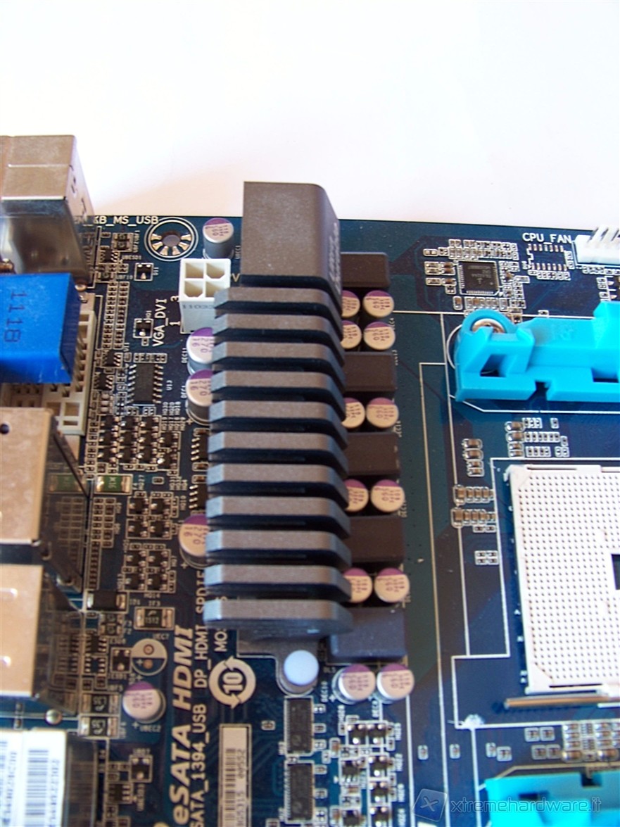 In prossimità del socket FM1 possiamo trovare la linea di MOSFET che alimentano la CPU ed il relativo dissipatore atto a raffreddarli.