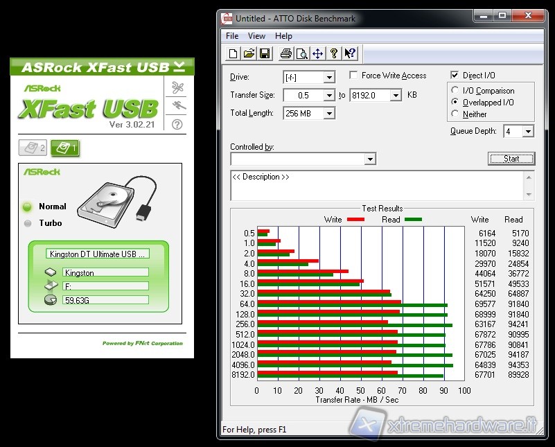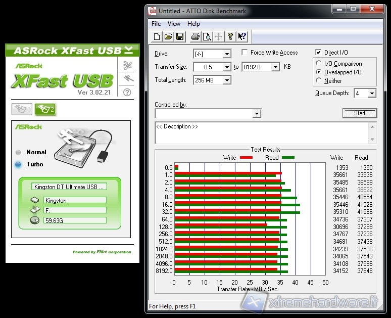 Esaminiamo insieme il Bandwith della Asrock X79 Extreme4 lato connettività sia USB 2.0 che 3.0. Verranno utilizzati ATTO e CrystalDiskMark per misurare i valori di Transfer-Rate connettendo il Pen Drive che abbiamo usato come campione, un Kingston DT Ultimate 64GB, sia ad una porta USB 3.0 che sulla più lenta USB 2.0.