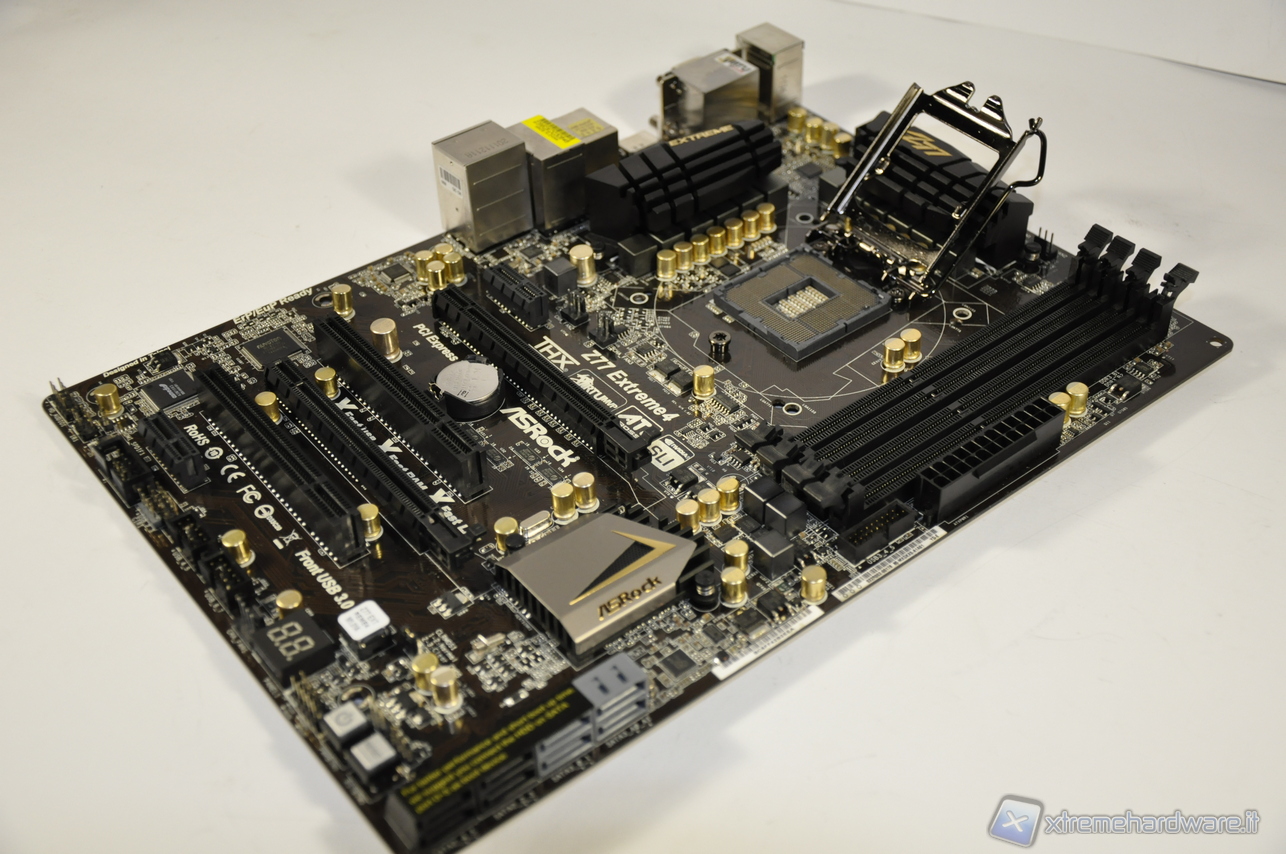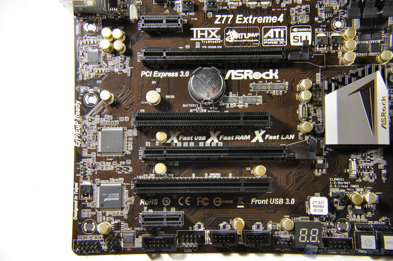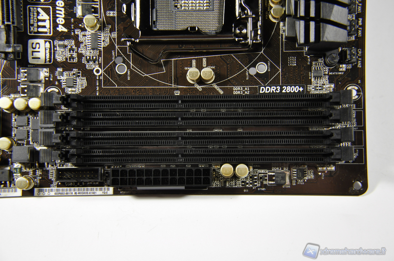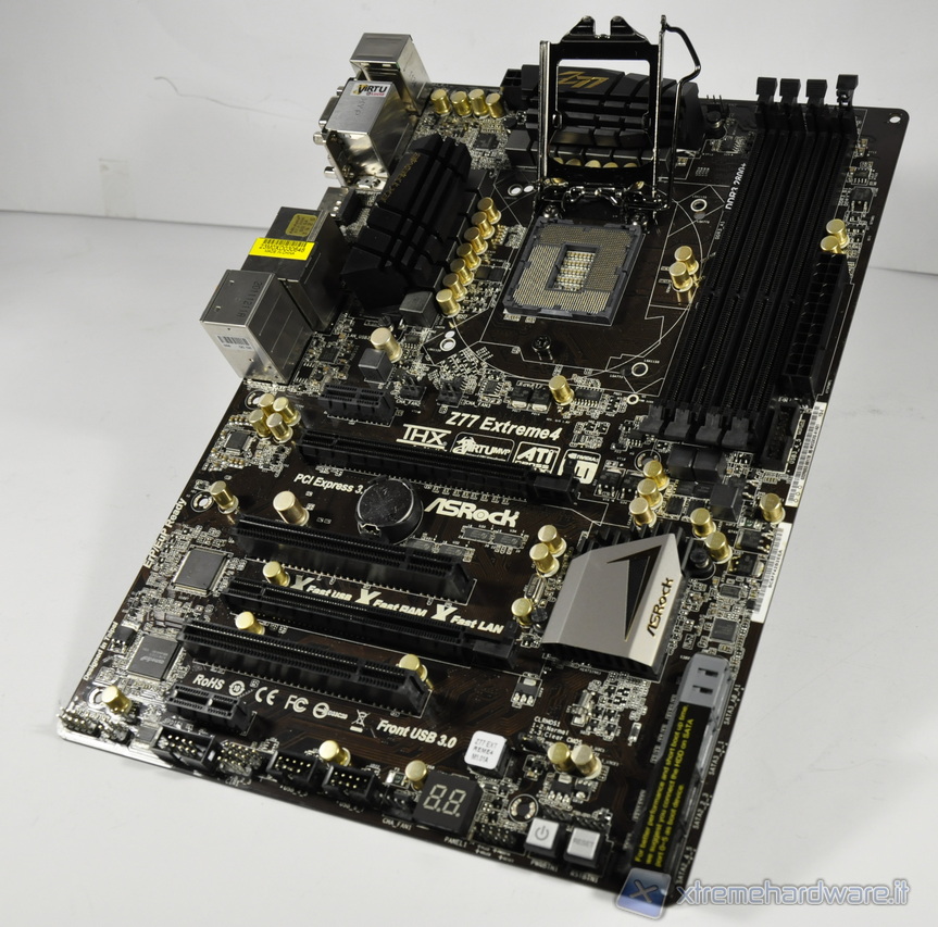 Il risalto del color oro dei condensatori sul PCB scuro dona un effetto elegante alla Z77 Extreme4. Le sue dimensioni di 30,5 per 21,8 cm la rendono più compatta rispetto alle schede madri in standard Full-ATX larghe invece 24,4 cm. 008