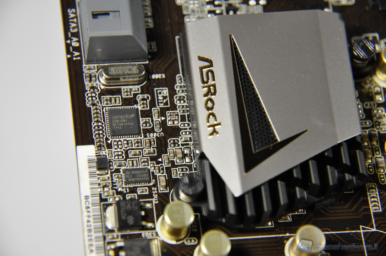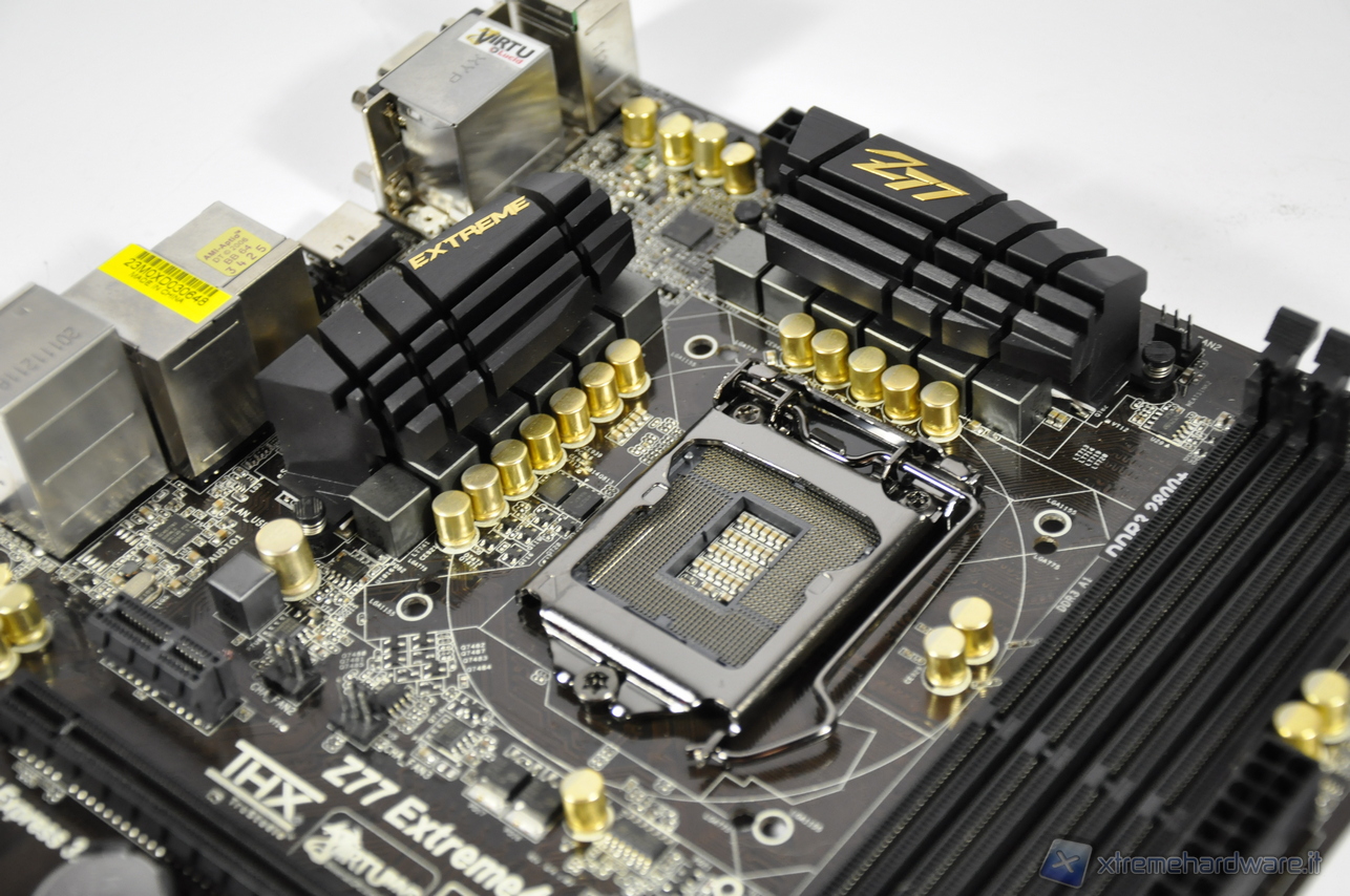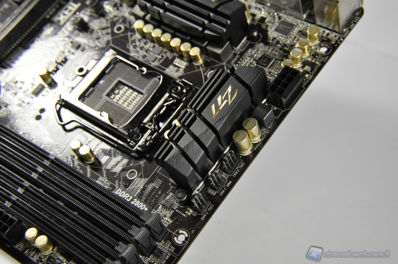 Il cuore della scheda, ossia la zona socket, è priva di elementi ingombranti in modo da permettere l’installazione di CPU cooler di grandi dimensioni. Due semplici dissipatori passivi neri, privi di heatpipe e decorati con scritte color oro, coprono i mosfet delle 8+4 fasi dedicate alla CPU e alle sue varie componenti derivate (IGP memory controller, etc). I solid capacitor placcati oro impreziosiscono l’aspetto esteriore della scheda.