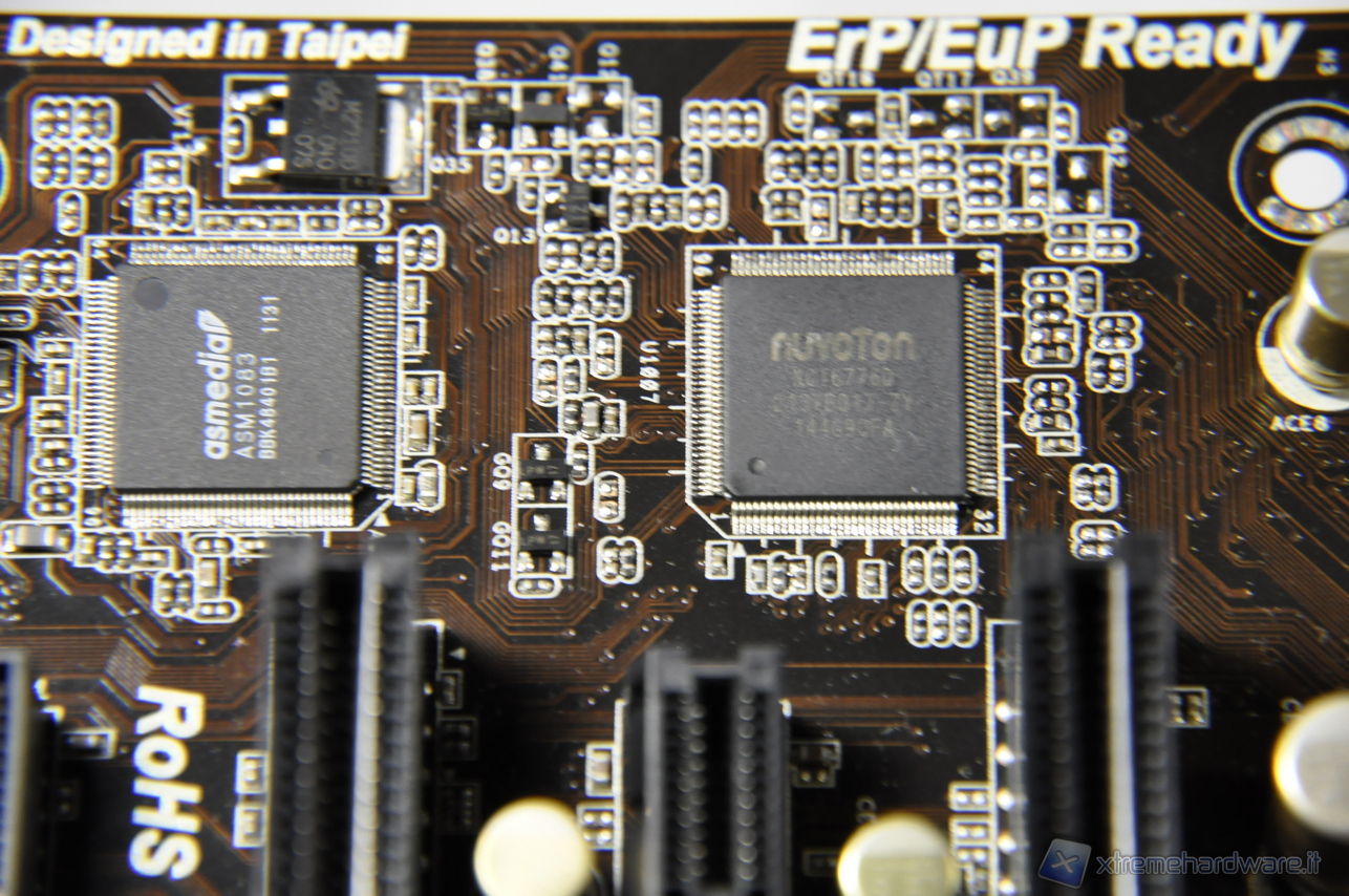 Grazie al chip ASMedia ASM1083 nella Z77 Extreme4 troviamo 2 slot PCI di vecchia generazione. Intel ne ha infatti eliminato il supporto dal chipset Z77 e devono pertanto essere gestiti da controller di terze parti. Alcuni produttori hanno scelto in realtà di abbandonare tale standard mentre ASRock ha deciso di mantenerlo in vita per la gioia di tutti coloro che dispongono di schede audio, acquisizione video, TV tuner, etc, basate su questo standard. Accanto all’ASM1083, il chip Nuvoton per il monitoraggio delle tensioni e delle temperature provenienti dalle zone critiche della scheda.