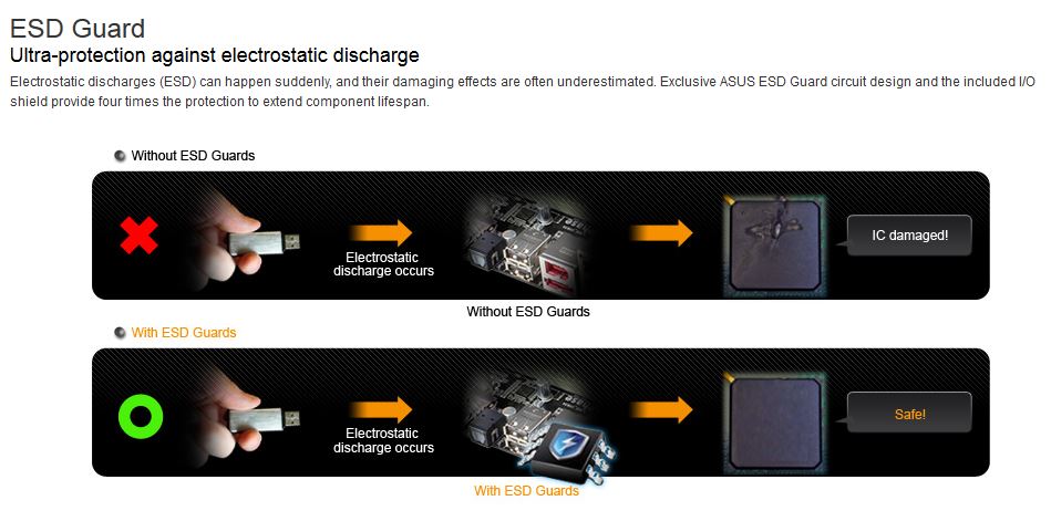 L’esclusivo sistema ASUS ESD Guard protegge le porte USB della motherboard da cariche elettrostatiche, estendendo così la vita dei componenti elettronici.