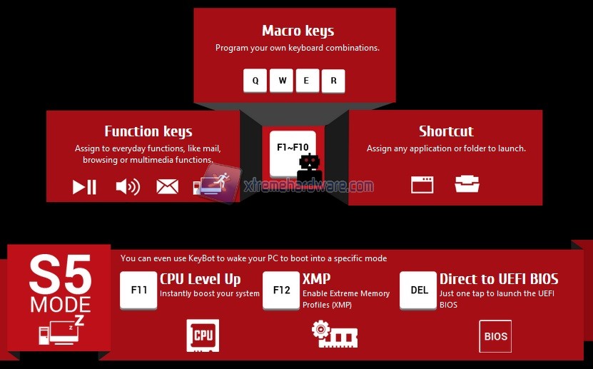 L’esclusivo chip KEYBOT presente sulla Maximus VII Gene permette di assegnare funzioni macro ai tasti funzione F1-F10 della tastiera, se collegata nella porta USB dedicata. Permette inoltre di fare il boot a BIOS o impostare parametri come il profilo XMP o il boost della CPU.