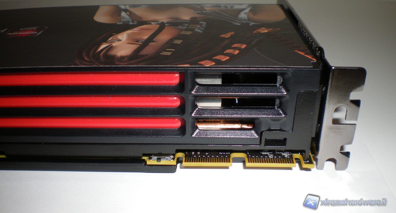 Le uscite disponibili sono diverse, abbiamo infatti due connessioni DVI, una HDMI, due display port 1.2, in questo modo è possibile gestire fino a 6 monitor usando la tecnologia Eyefinity di AMD. Nella parte superiore è possibile scorgere due connessioni dove vanno inseriti due bridge CrossFire, per potere collegare le schede anche in modalità CrossFire-X. Abbiamo anche la presenza di un selettore bios, che ci permette, in caso di flash non andati a buon fine, di recuperare la nostra scheda, senza avere bisogno di schede alternative per ripristinare il bios. Ci basta infatti selezionare il Bios protetto e la scheda riparte tranquillamente.
