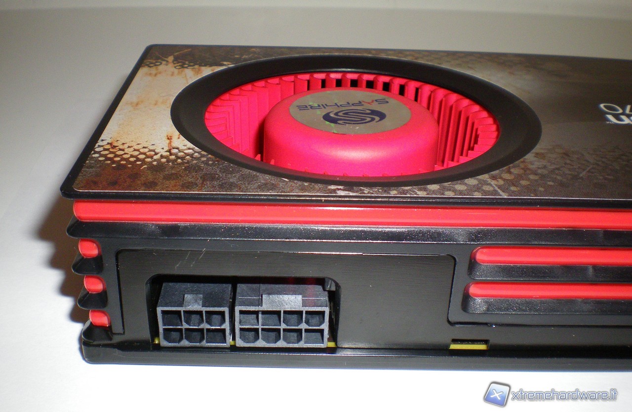 Le Sapphire HD6970, come del resto tutti i modelli reference, hanno bisogno di due connessioni di alimentazione, uno a 6pin e uno a 8pin. Nel particolare potete osservare anche la ventola che provvede ad incanalare l'aria fredda verso il dissipatore interno per raffreddare il chip grafico, generando una pressione tale da raffreddare le alette.