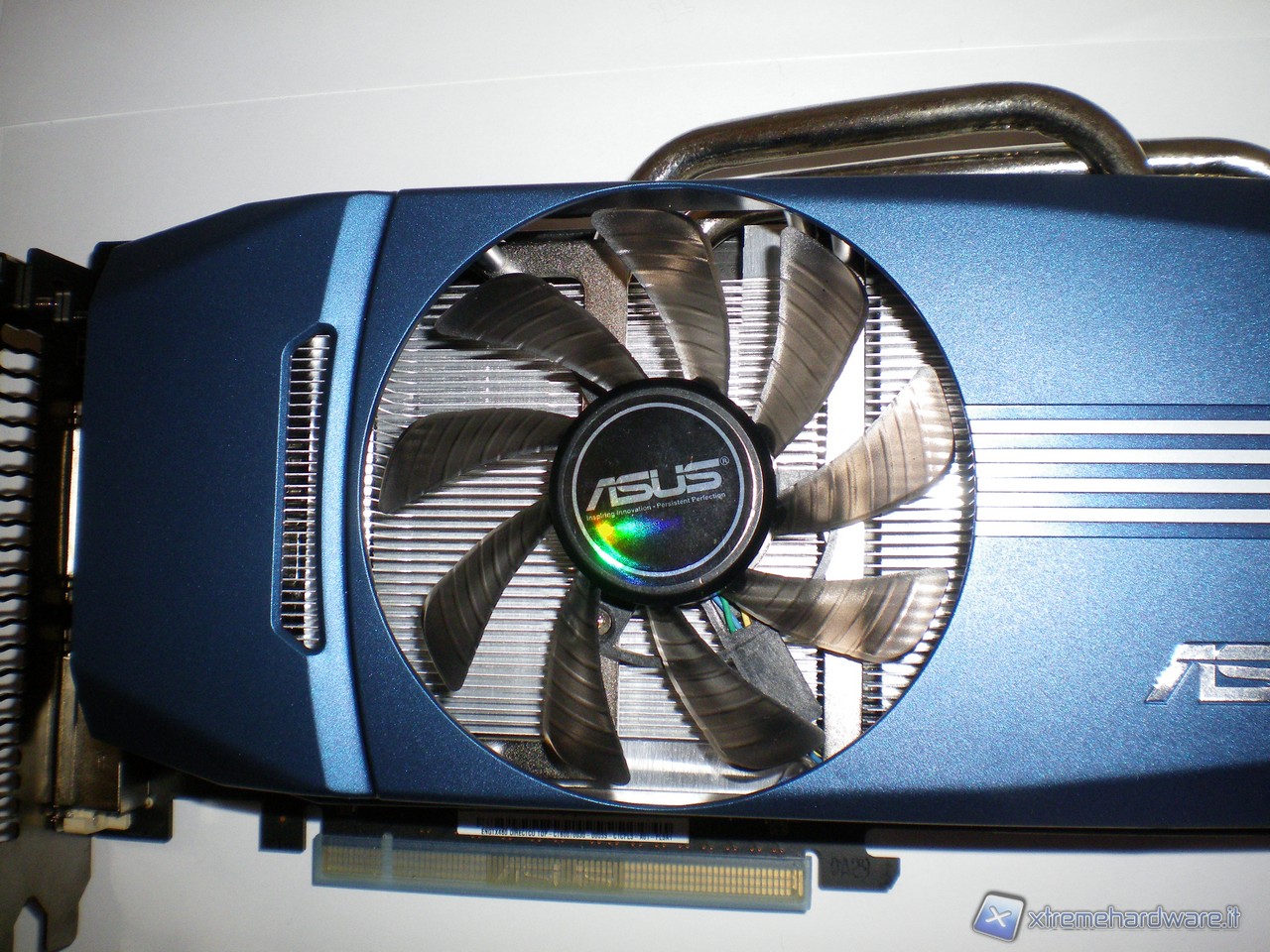 La scheda si presenta quindi con una copertura plastica di colore blu che sovrasta il sistema di reffreddamento che vi è sotto di esso. Il sistema usato da ASUS prevede un dissipatore di calore in alluminio con base in rame, che è composto da fitte alettature, sempre in alluminio e da 3 heat-pipe principali da 8mm che collegato la base in rame che poggia sul core alle alette. In questo modo il trasferimento di calore dal core grafico alle alette passa in maniera più veloce. La ventola da 80mm presente in questo sistema provvede a raffreddare in maniera adeguata, garantendo temperature di funzionamento nella norma.