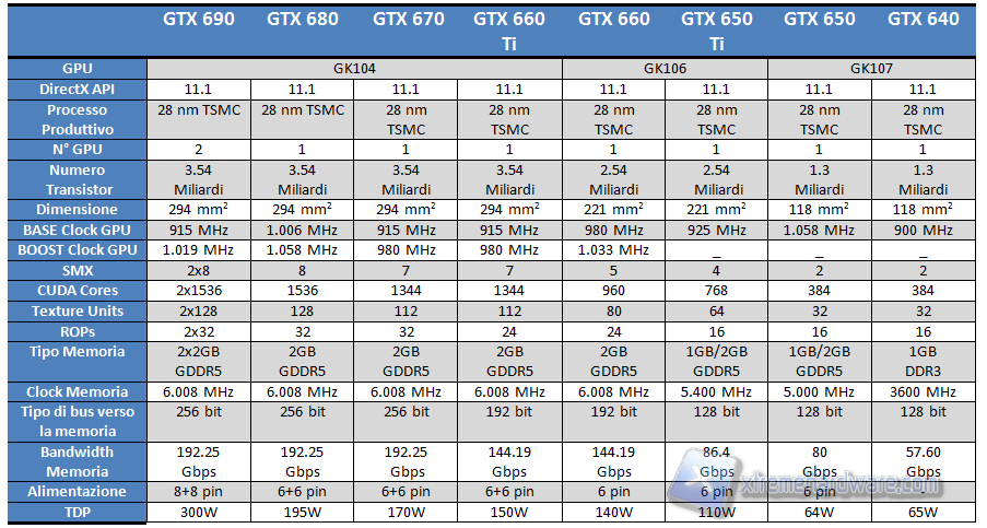 Sotto potete osservare la tabella comparativa dei modelli di GeForce serie 6 equipaggiati con il chip grafico Kepler: