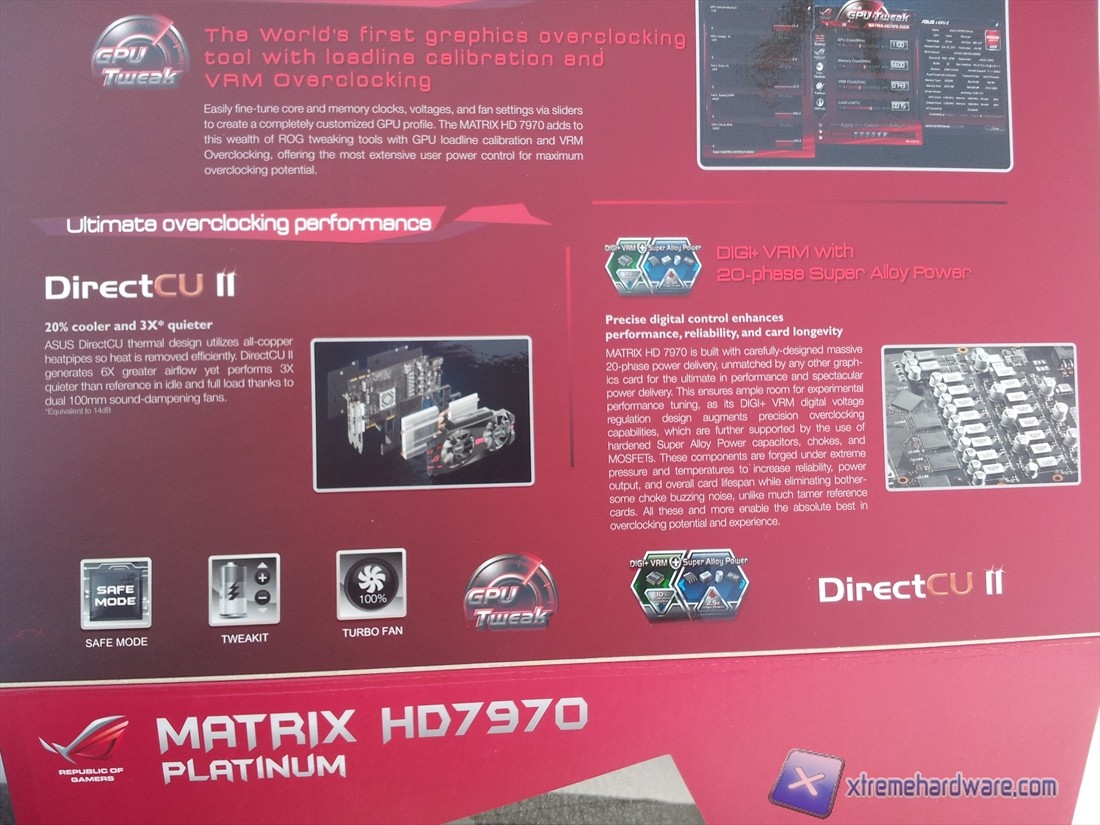 Come abbiamo già avuto modo di notare in passato, le schede video appartenenti alla serie Matrix sono imponenti e maestose a partire dalla confezione nella quale vengono commercializzate, la dimensione della scatola della ASUS HD 7970 Matrix Platinum risulta infatti ben maggiore addirittura rispetto alla grandezza delle confezioni adibite alle schede madri della stessa casa produttrice.