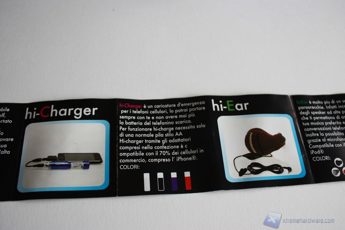 Lateralmente troviamo una cerniera al cui interno è presente un cartoncino-striscia con la gamma di prodotti Hi-Fun e il cavo audio jack da 3.5 mm da inserire nell'appoisto ingresso sul nostro smartphone.