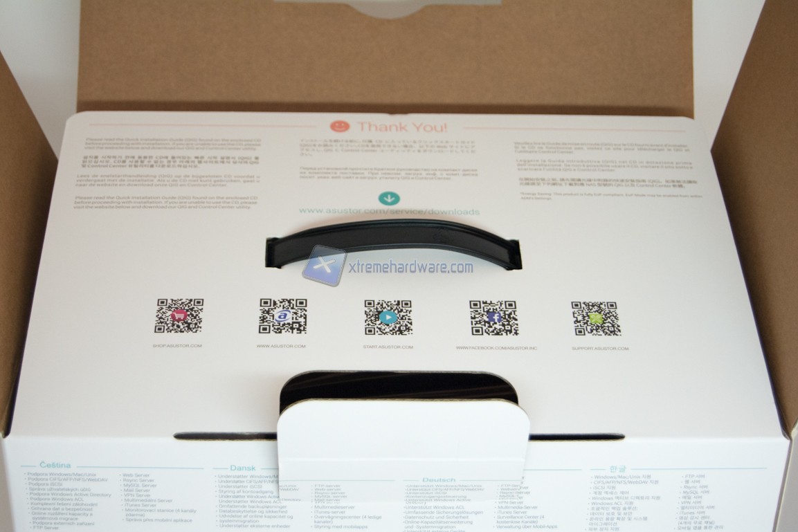 Sollevando il coperchio troviamo delle scritte di “ringraziamento” per l’acquisto e cinque QR code stampati che ci rimandano alle varie sezioni del sito internet del produttore.