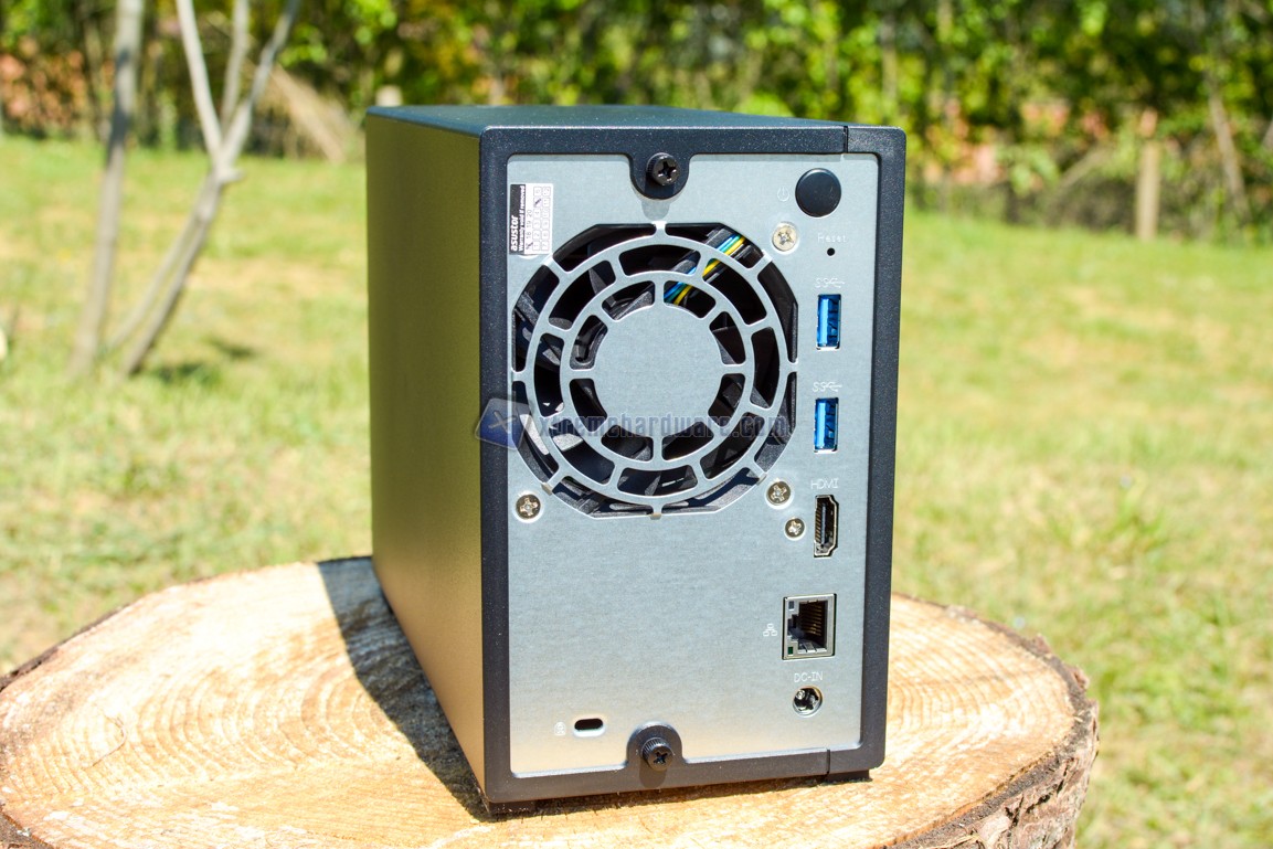 Sul retro trovano posto una ventola da 70mm posta in estrazione, il tasto di accensione, un tasto Reset, due porte USB 3.0, la porta HDMI 1.4b, una porta LAN RJ-45, plug per l’alimentatore di corrente e kensington lock.