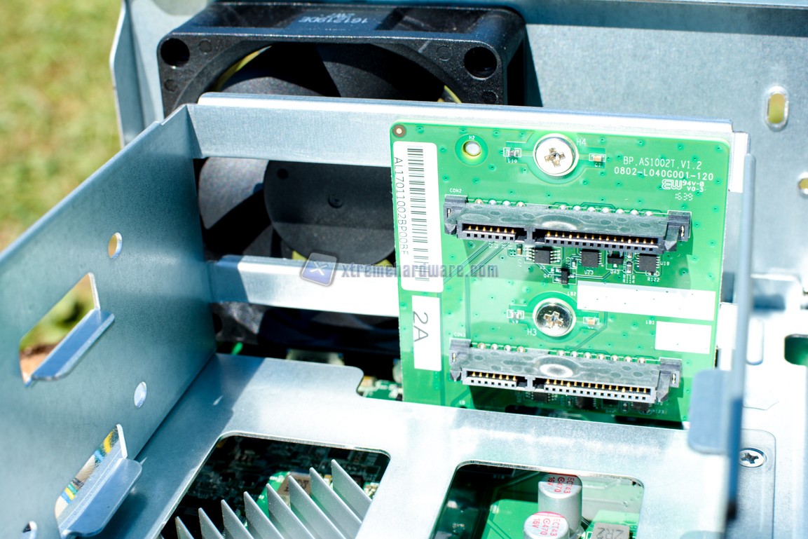Scorgiamo i collegamenti SATA e l’alloggiamento metallico per i dischi e sotto il telaio il dissipatore che raffredda l’Intel Celeron Quad-Core del quale il nostro AS3202T è fornito.
