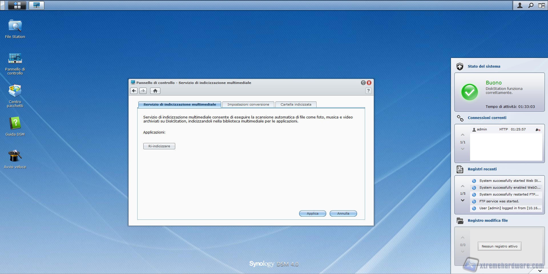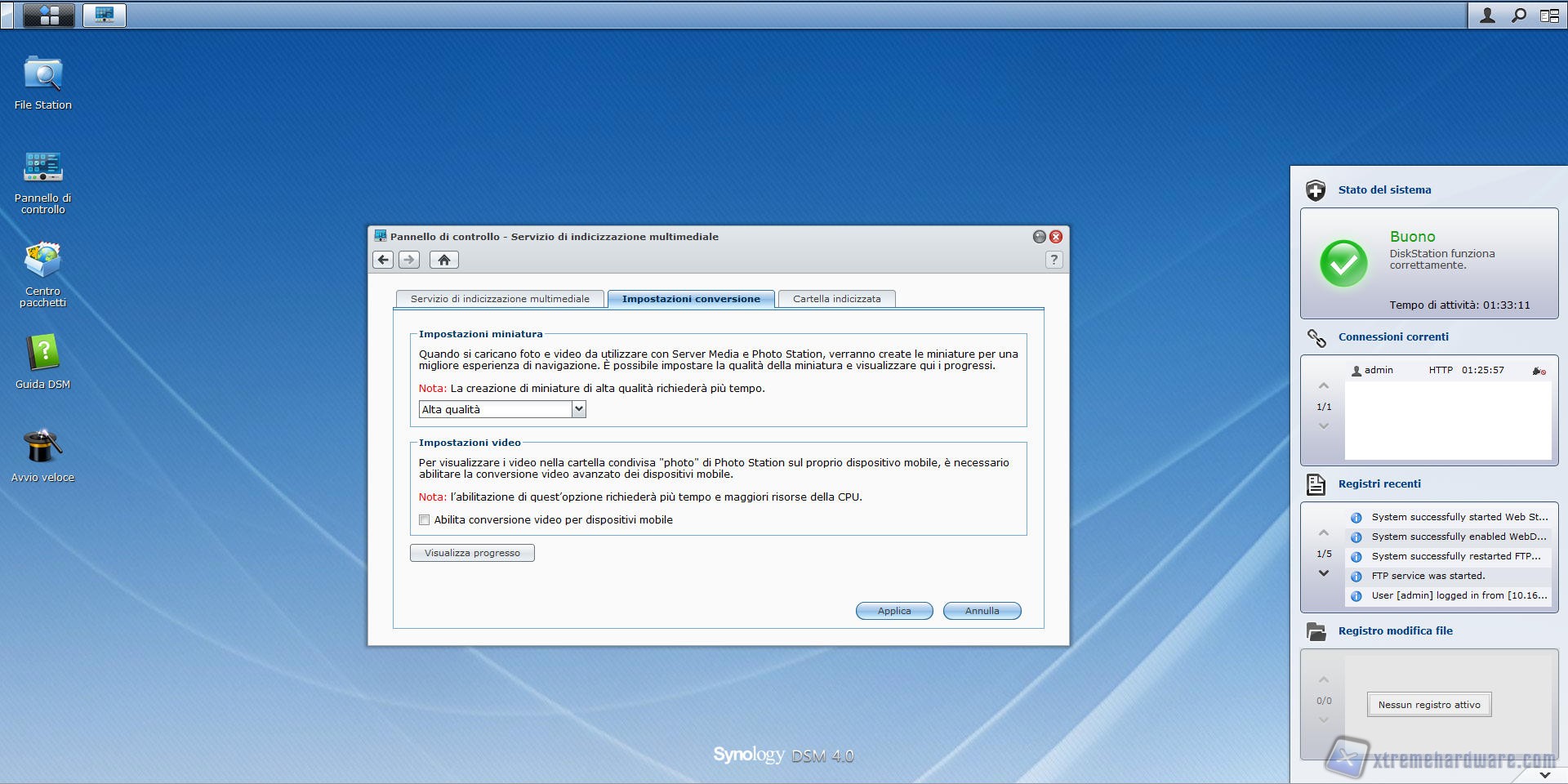 La prima schermata del “Servizio di indicizzazione multimediale” permette la scansione dell'intero sistema alla ricerca di file multimediali che verranno indicizzati e catalogati in maniera ordinata.La seconda tab, “impostazioni conversione”, permette all’utente di impostare la qualità delle miniature che si creano in Server Media e Photo Station nel momento in cui si caricano delle fotografie.La voce “impostazioni video” permette la conversione dei video necessaria per la visualizzazione tramite i dispositivi mobile. L’ultima finestra che incontriamo è “cartella indicizzata” che ci permette di creare una cartella, per l’appunto, dove verranno indicizzati tutti i file multimediali presenti all’interno del sistema.