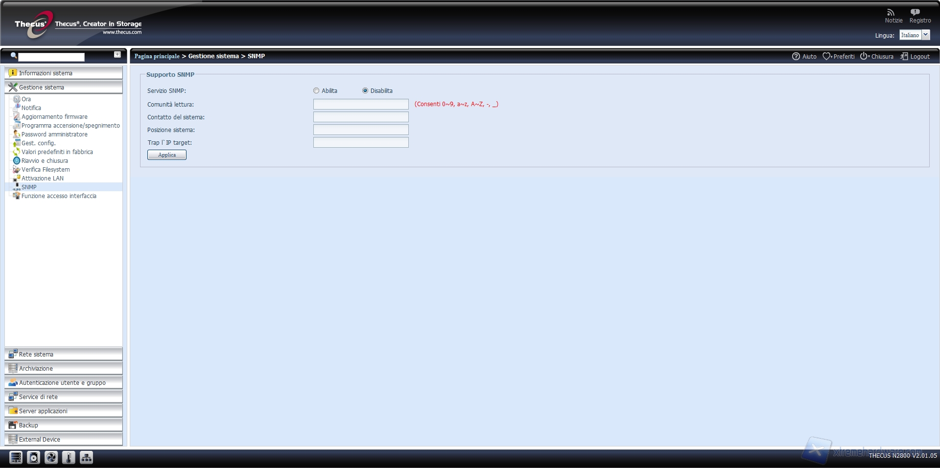 Se vogliamo utilizzare i servizi “Web Disk”, “Server Foto” e “Modulo” dobbiamo prima attivarli tramite questo menù che è, inoltre, l’ultimo che troviamo nella macro-sezione “Gestione Sistema”.