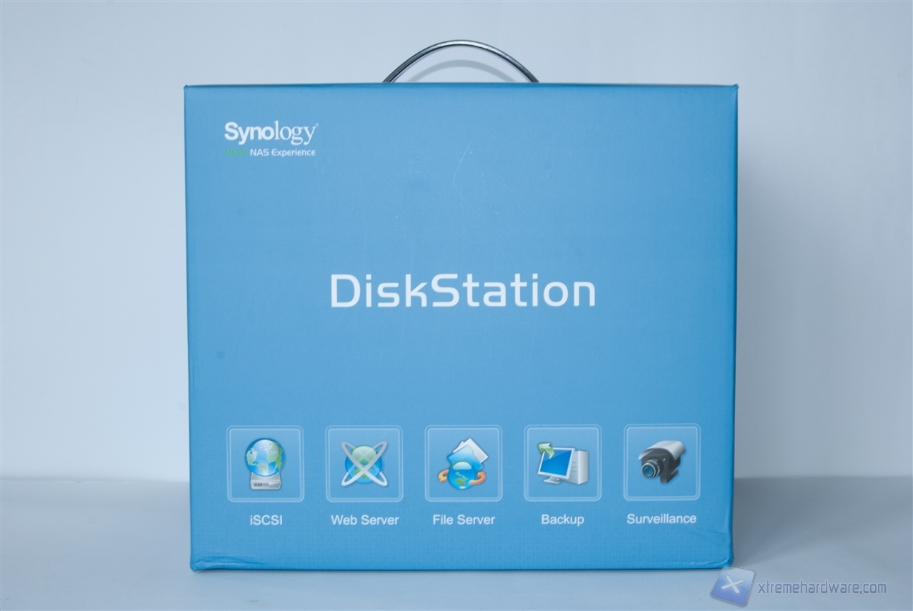 La parte frontale presenta la scritta "DiskStation", rappresentante la famiglia di prodotti della quale fa parte il NAS in questione, ed alcune icone inerenti alle features principali del sistema.