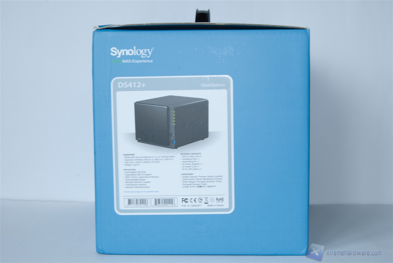 Come per gli altri modelli, anche la scatola del DS412+ si presenta di un colore blu sgargiante e riporta informazioni utili all'acquisto.