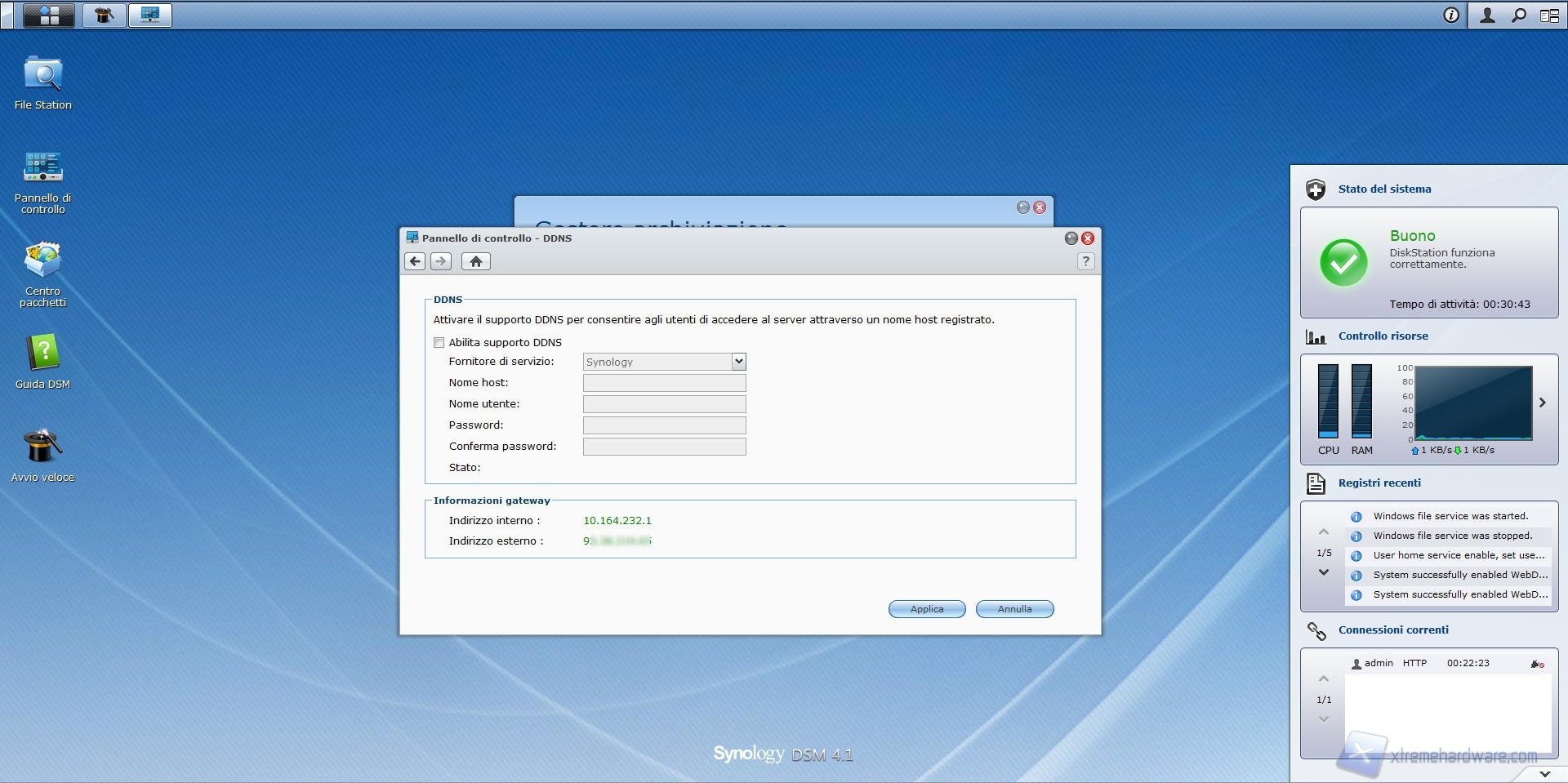 Se il nostro sistema ha un indirizzo IP variabile e non statico, possiamo riscontrare dei problemi nel caso volessimo accedere al Synology DS412+ da postazione remota; in tal caso se abbiamo registrato un host che ci faccia da relink tramite DDNS al nostro sistema, configuriamo questa schermata ed i problemi saranno risolti.